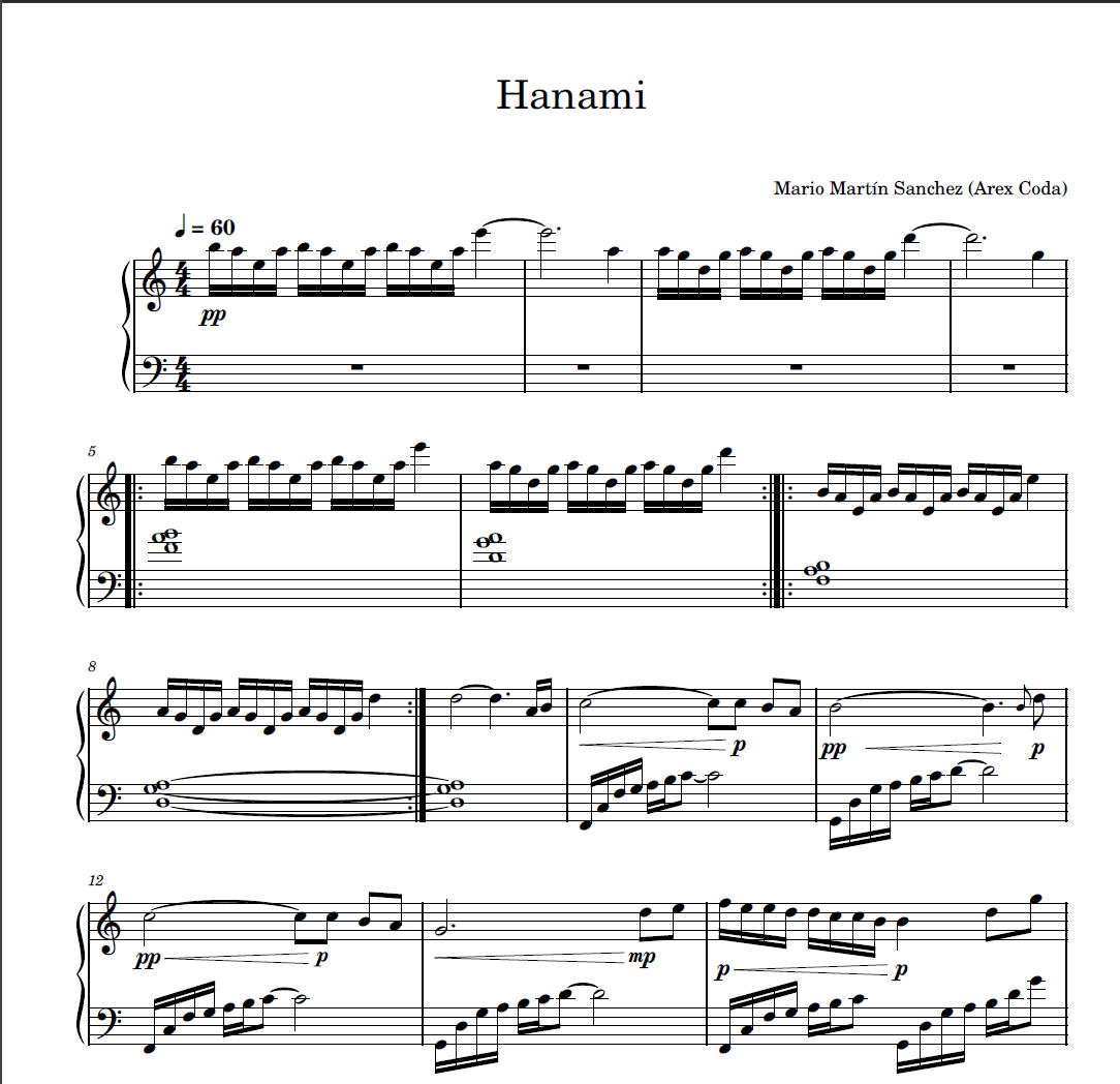 Partitura digital en formato PDF del single para piano "Hanami" de Arex Coda.