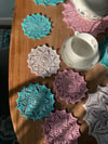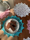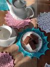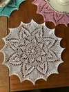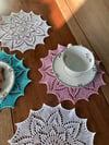 Prynhawn Da is Welsh for ‘Good Afternoon’, and an afternoon tea accompanied by these place settings would be a good afternoon indeed. The Pi shawl construction allows a natural and elegant development of the pattern from coaster to place mat.