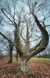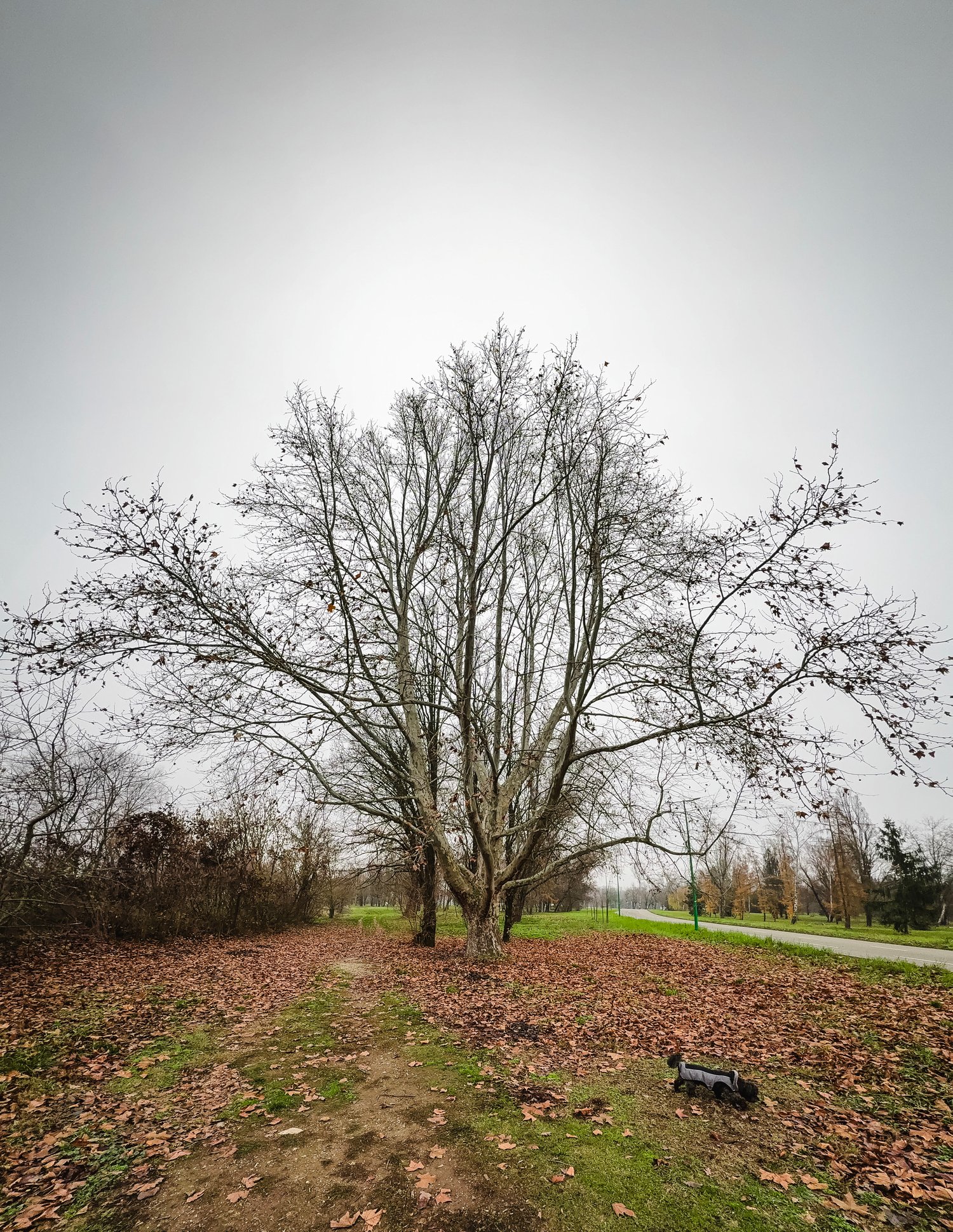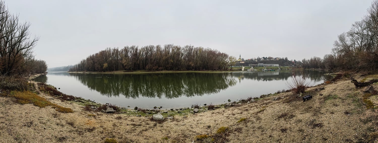 A peaceful riverside village with small houses and a church on a hillside reflected in calm water. Muted colors, bare trees and still reflections create a quiet, tranquil atmosphere with a sense of rural life and timelessness.