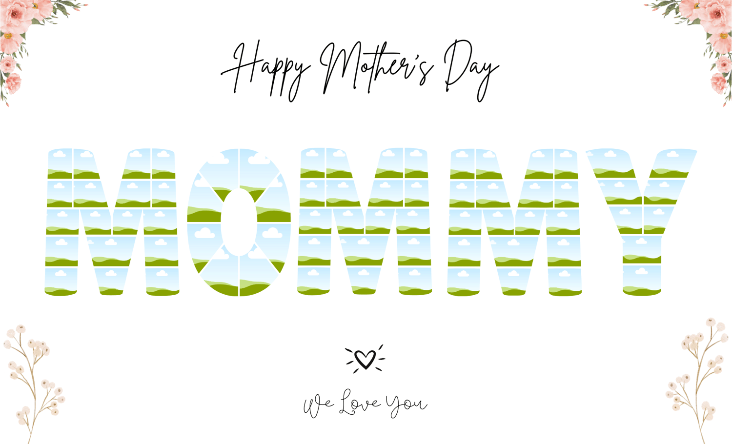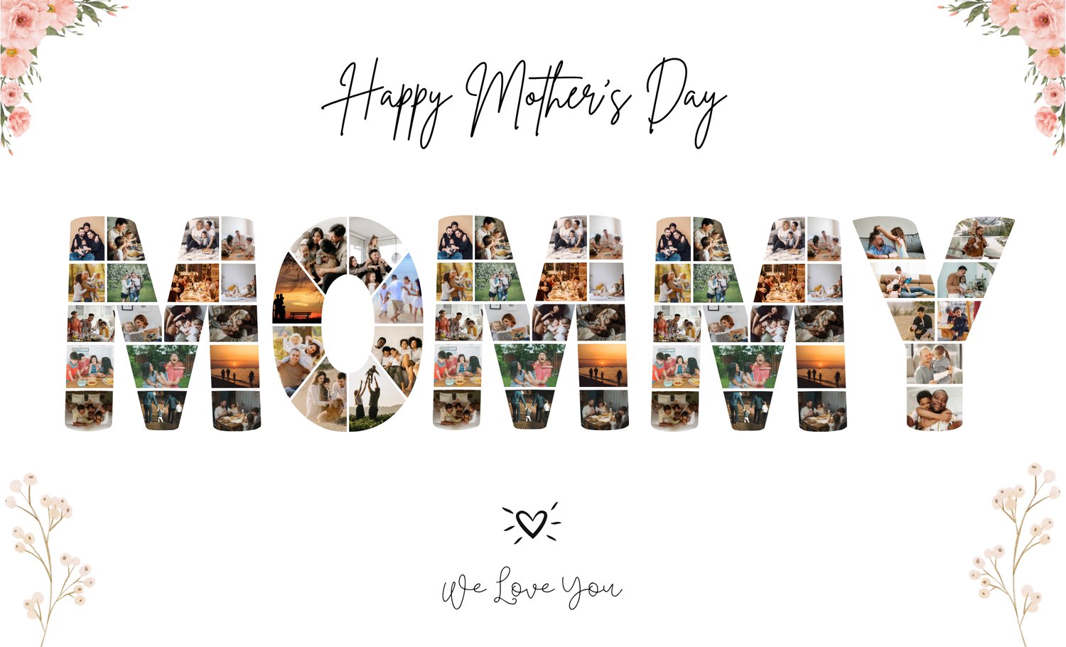 An editable Canva template featuring a modern MOMMY-shaped photo collage, ready for you to customize. It's high resolution and printable, ideal for framing or sharing digitally.