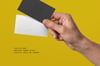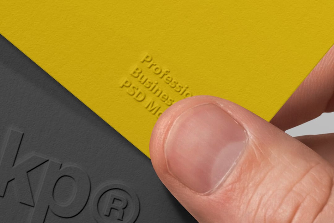 High-resolution business card mockup featuring a hand holding two embossed cards with isolated lights and shadows. 7300 x 5000 px PSD for branding and corporate identity previews.