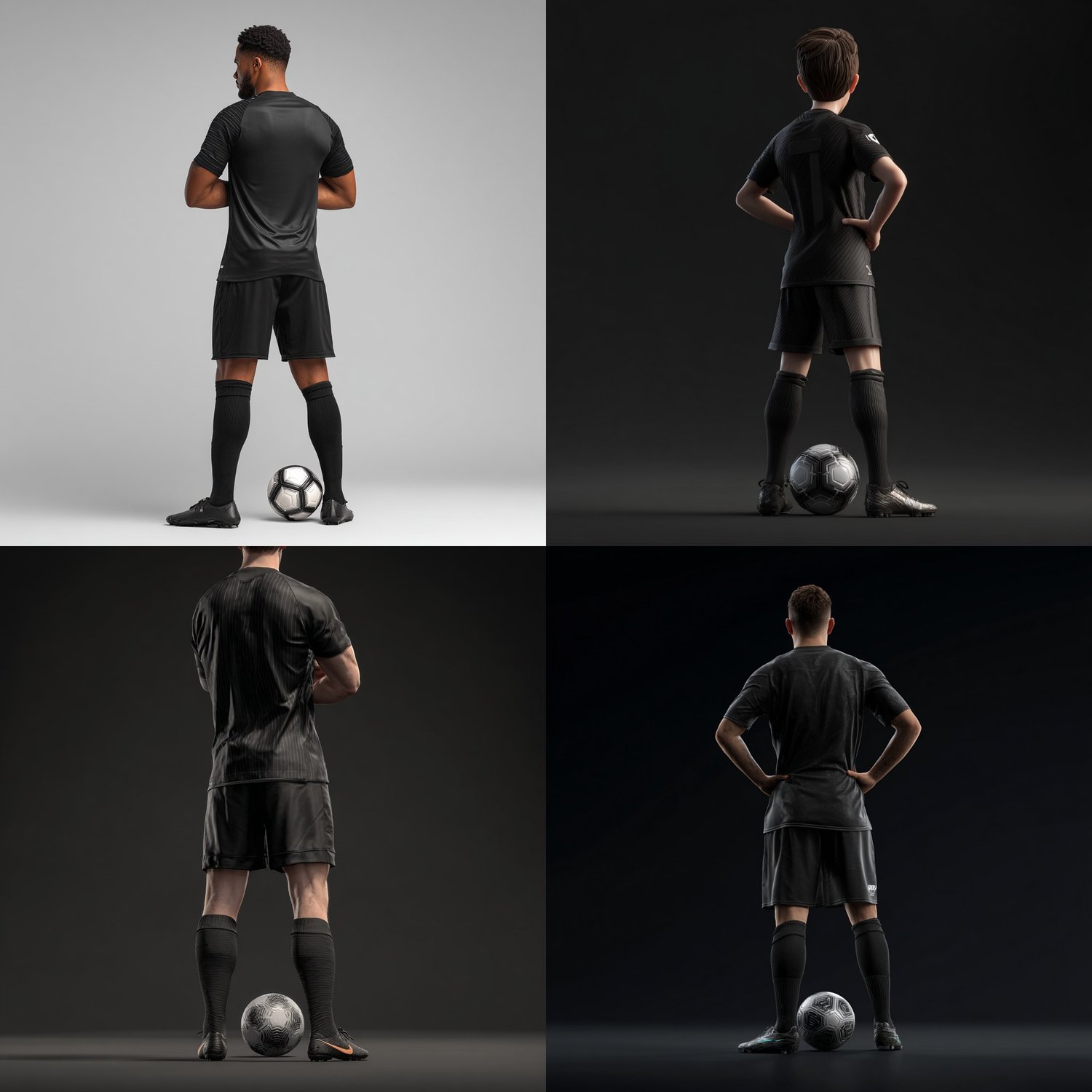 Design a realistic, modern football player with this AI prompt, inspired by FIFA 26. The character is seen from the back, arms folded, with one foot resting on a classic black-and-white football. Clad in a sleek, all-black kit with a minimal design and no logos, numbers, or branding, the player embodies a clean, professional aesthetic. Realistic fabric textures and subtle lighting bring the figure to life, perfect for sports concept art, game-ready visuals, and digital illustrations. Capture the modern athlete with cinematic detail and professional realism, ready to enhance portfolios or creative projects.