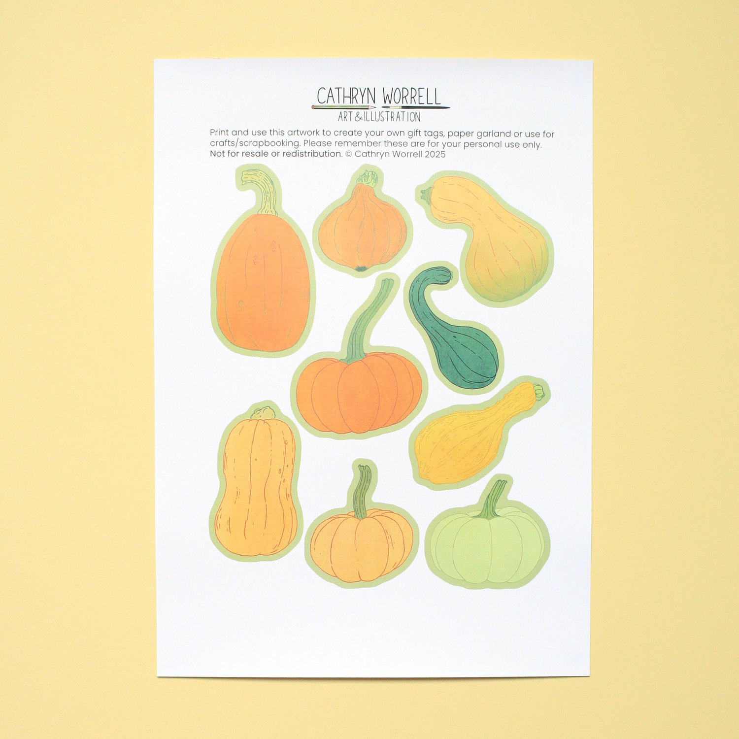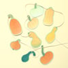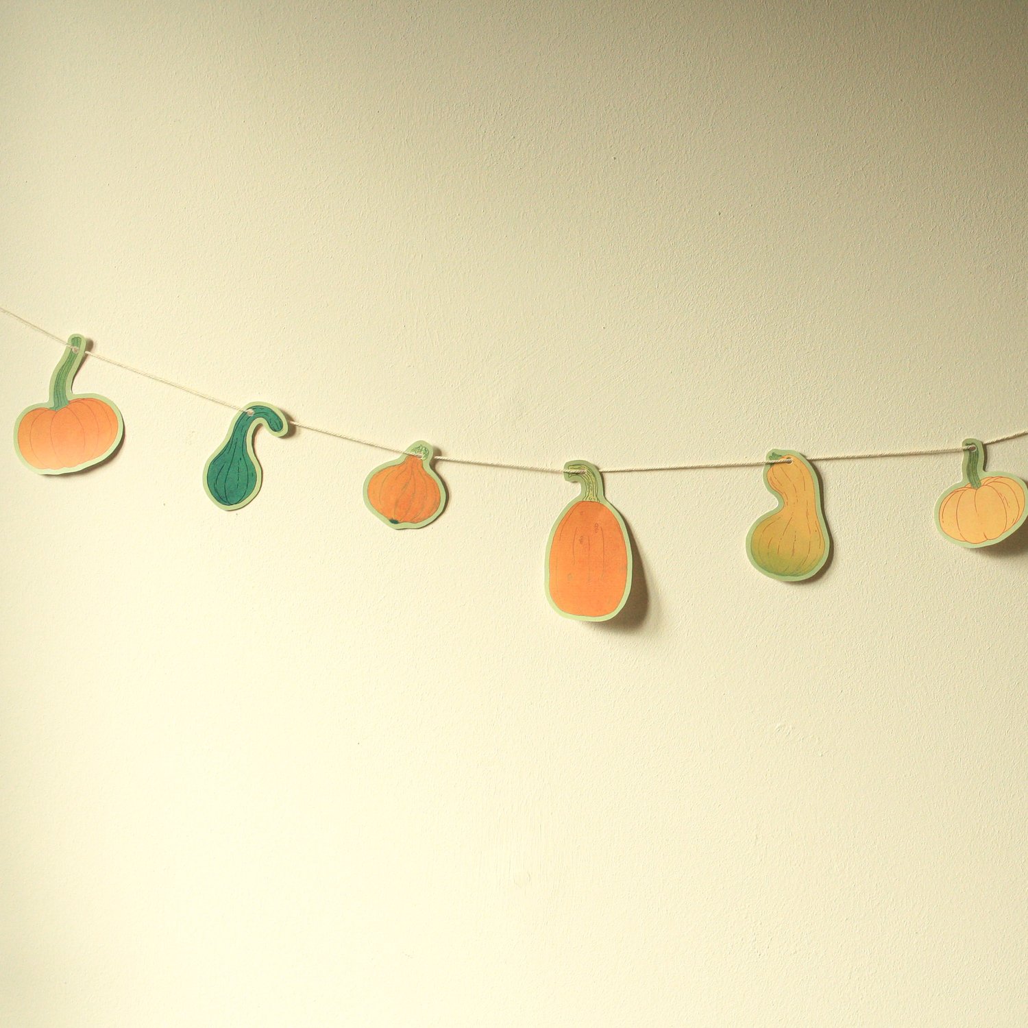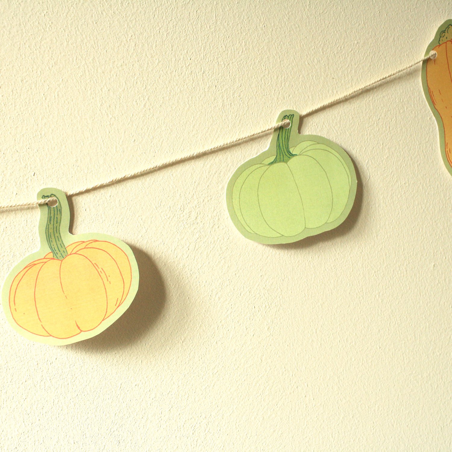 This paper garland features my original illustrations of 9 pumpkins and squash in shades of orange, green and yellow. It's perfect for decorating your home all year round but is especially nice for parties, Thanksgiving and kids' rooms. It's ready to download immediately and print at home so you can get 'crafty' right away.