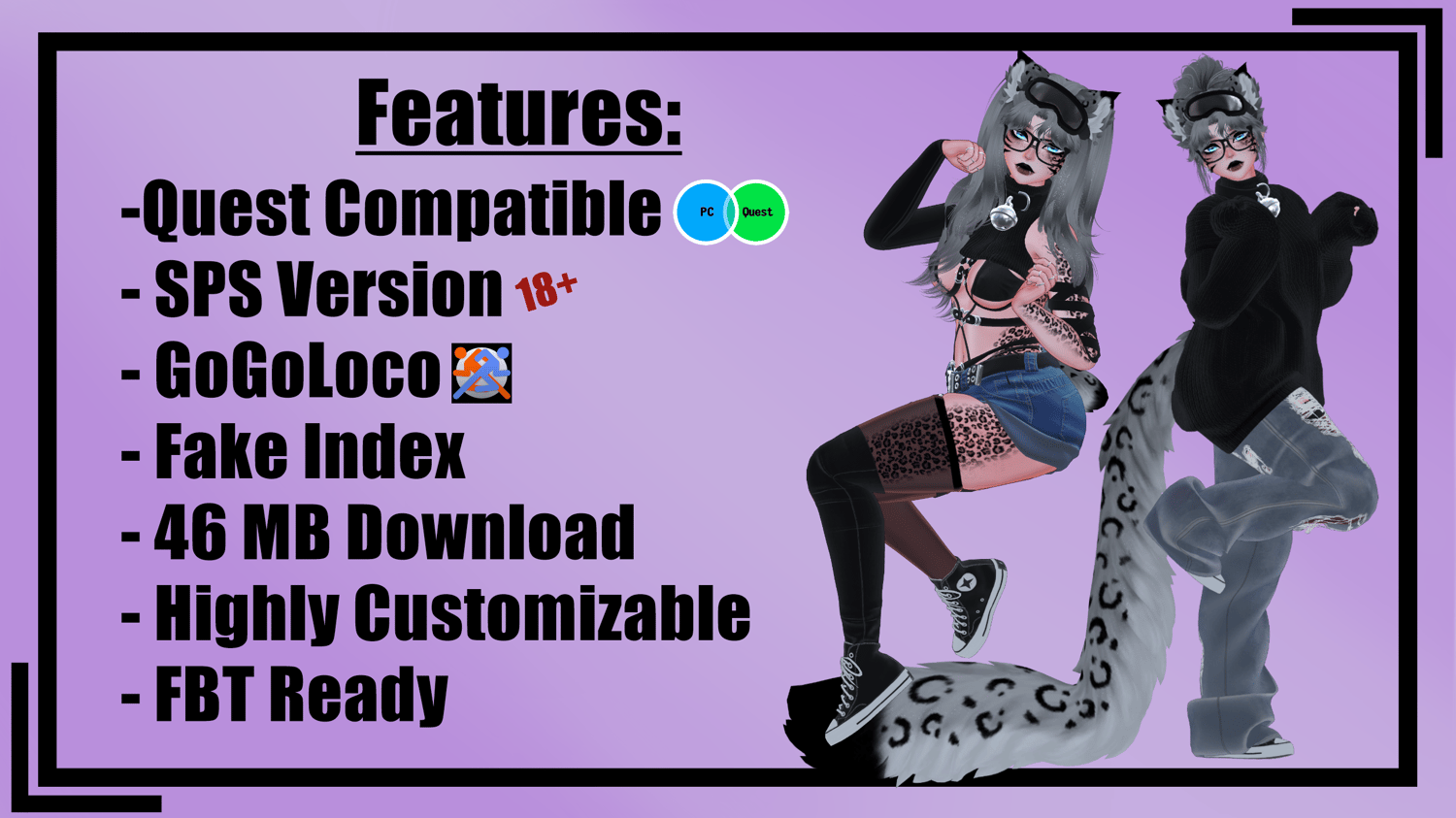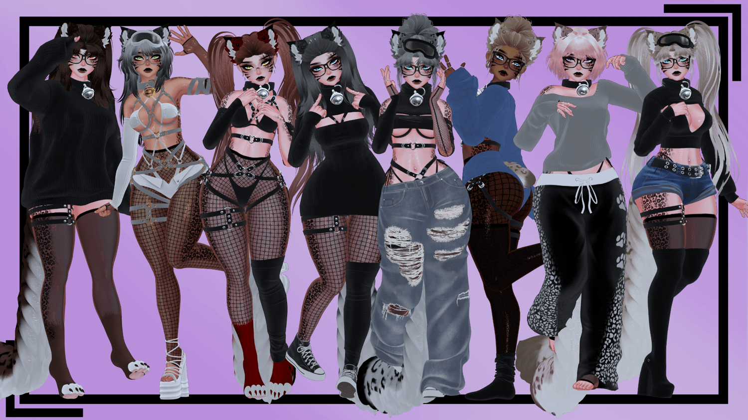 | Body by zinpia (EDITED BY ME, NO REUSE) | Head/Head Textures by DUCC#0008 (EDITED BY ME, NO REUSE) | Main Body Texture by Ying#6669 (EDITED BY ME, NO REUSE) | Hair Textures by Cicieaaa#7777 | Fluff's ToolBox | VRCFury Tool | GoGoLoco by Franada | Glasses by Salted | Converse by Plaz | Wholesome! by Wholesomevr | Rings by DaddyIssuez | Ears/Big Tail/Docked Tail by DaCozyGremlin | Bandeau/Glove/Belly Ring/Arm Wrap by Linxx | Halter Top by Linxx | Long Sleeve Sweater/Garter/Sock by Linxx | Long Hair/Short Hair by Minki | Mya Hair/Bun Hair/Bangs by Nessy | Goggles/Collar by Nessy | Heels by yuuriii | Belt Shorts/PJ Set by Nessy | Pigtails by Bunisu | PJ Pants by GM | Fishnets by Beaniebaby | Leopard Texture by Blenity | Converse by Plaz | Boots by JinxieWinks | Arm Fishnets by Kypher | Big Sweater by Miriam | Bodysuit by Sadge | Arm Warmers by Xero3D | Baggy Jeans by Saikura | Harness by Olympus/Area | Bikini Set by Berryvee | Short Crop Sweater by CringySlipped Sweater by Lolo3D | Dress by Skeletib | Socks by Zammy | Unity Capture Tool by Naudine | Showcase by carnor | Pictures by Carnor and myself |