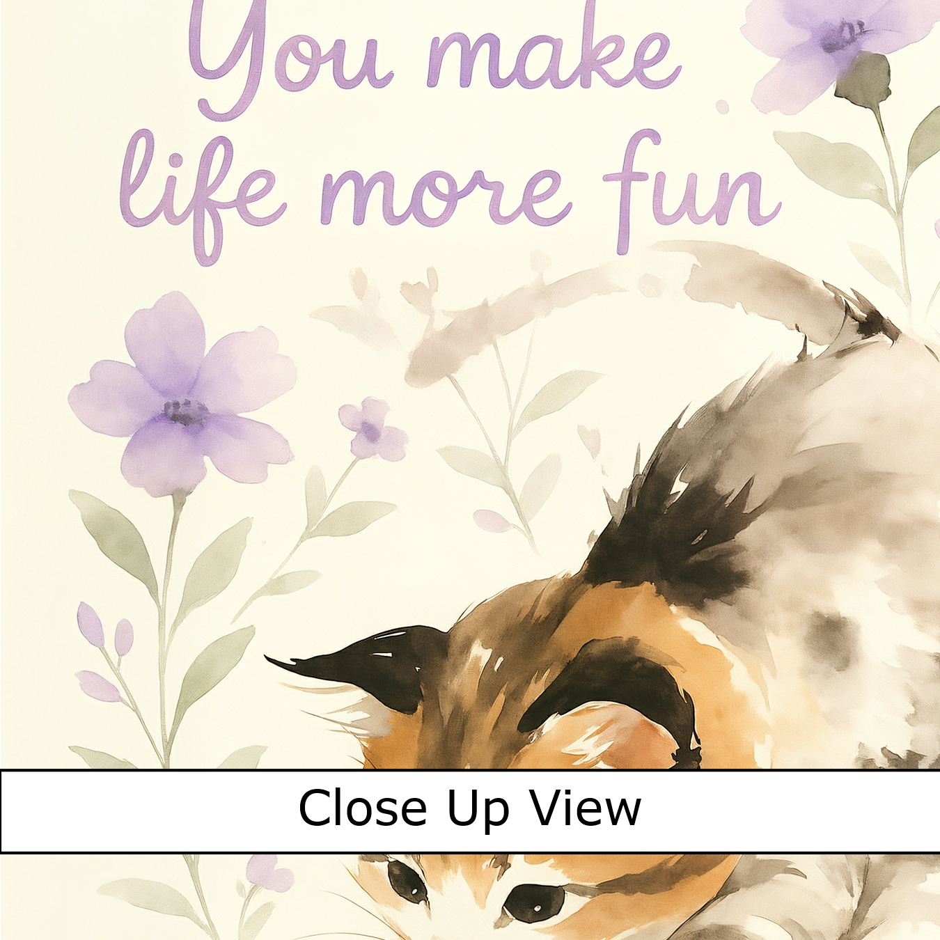 This charming printable greeting card features a watercolor kitten playing with yarn, surrounded by delicate purple flowers and the joyful message, "You make life more fun." Perfect for friends, loved ones, or anyone who brings joy to your world, this card is a sweet way to show appreciation.