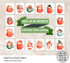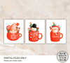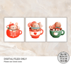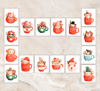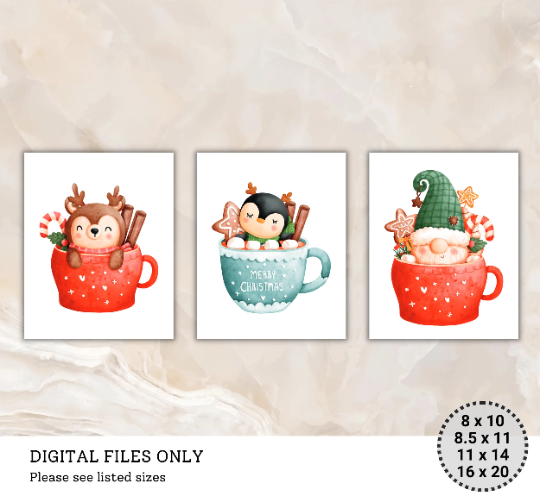 Bundle of 16 ultra cute printable posters featuring gnomes/elves and animals snuggled up inside Christmas themed cocoa mugs with spices and accessories -- includes little gnome friends, snowman, santa, squirrel, gingerbread cookie, panda, penguin, reindeer, bunny, lion, and fox. Makes an adorable gallery wall for a home, office or classroom, holiday party decor, name tags, or gift for a teacher / friend.