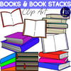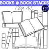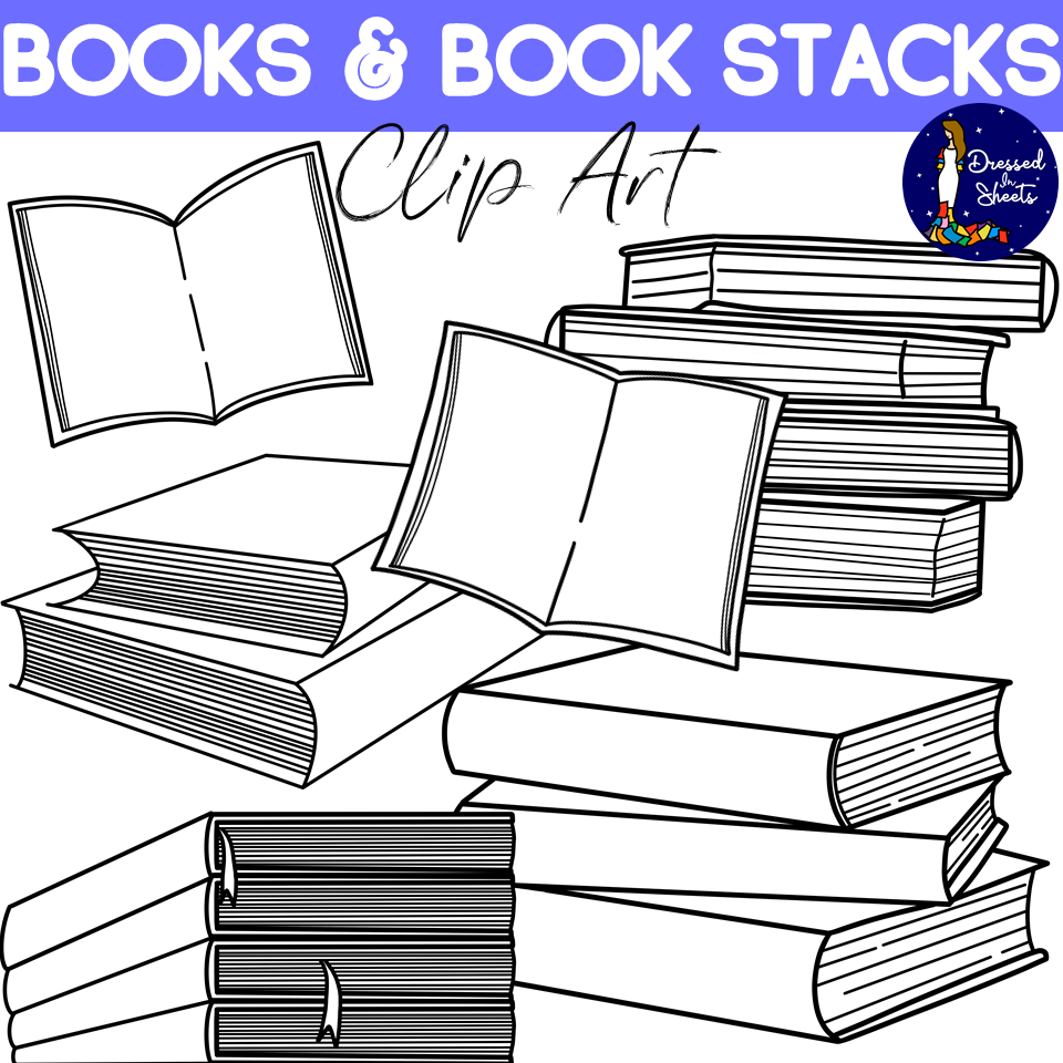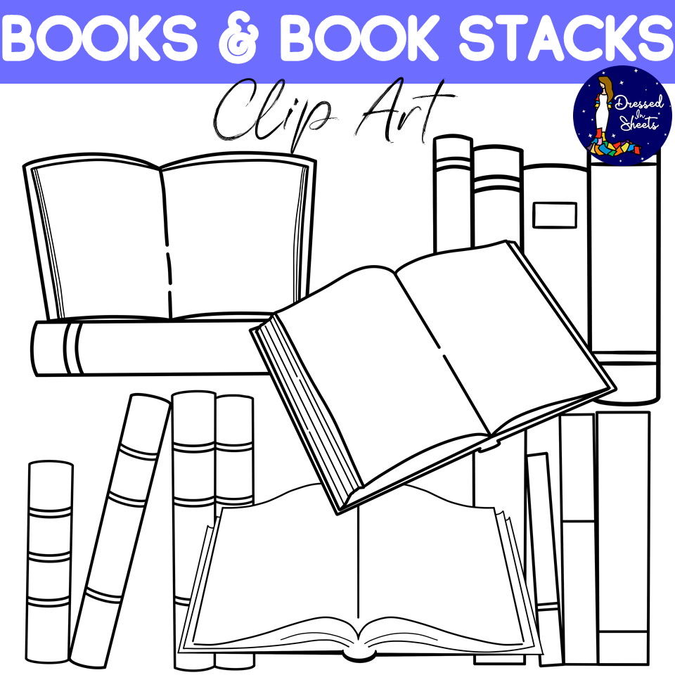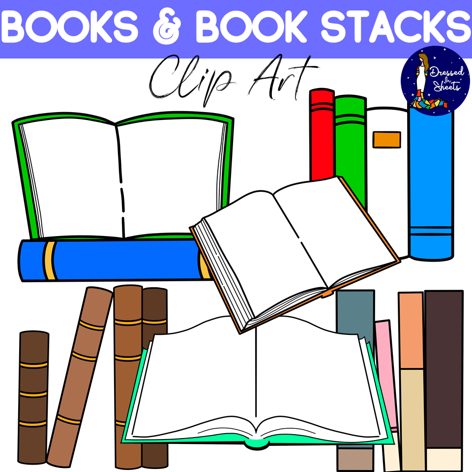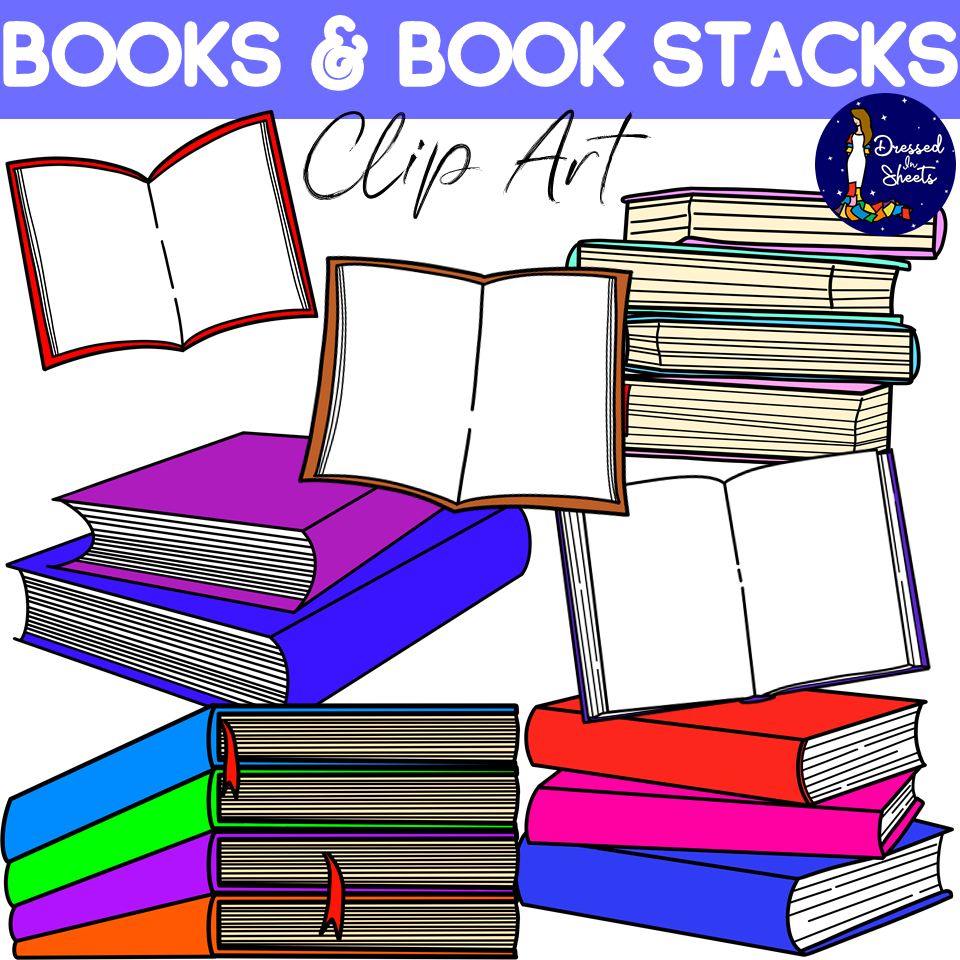 Contains: open books, stacked books, upright books, and bookmarked books.