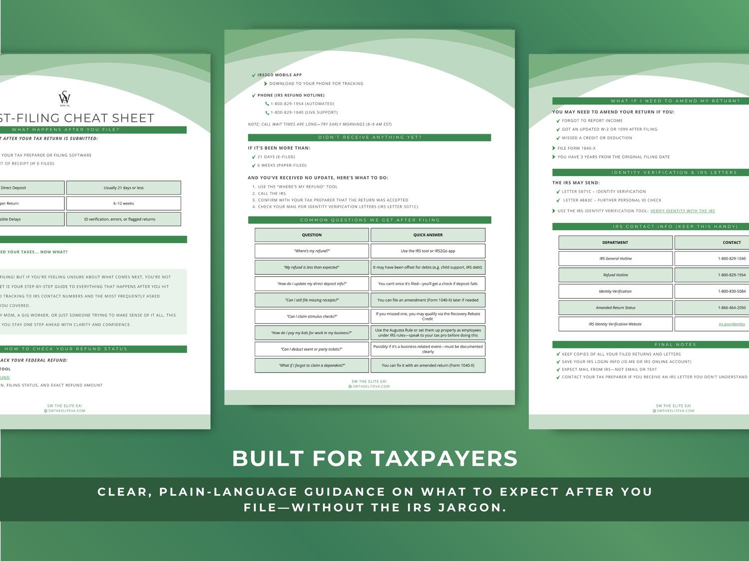 Perfect for everyday taxpayers waiting on refunds, busy families who want clarity, or tax professionals who want to give clients a simple post-filing handout.