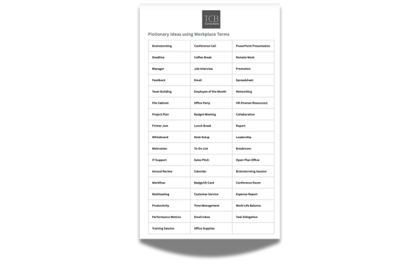 This printable set includes workplace-themed words and concepts perfect for your next office game session or virtual team-building event.