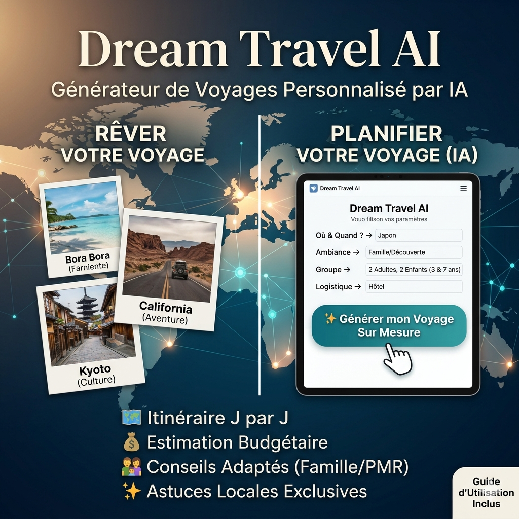 - 🗺️ Un itinéraire complet jour par jour : Planifié selon votre destination et l'ambiance choisie (Aventure, Farniente, Famille, Luxe...).
