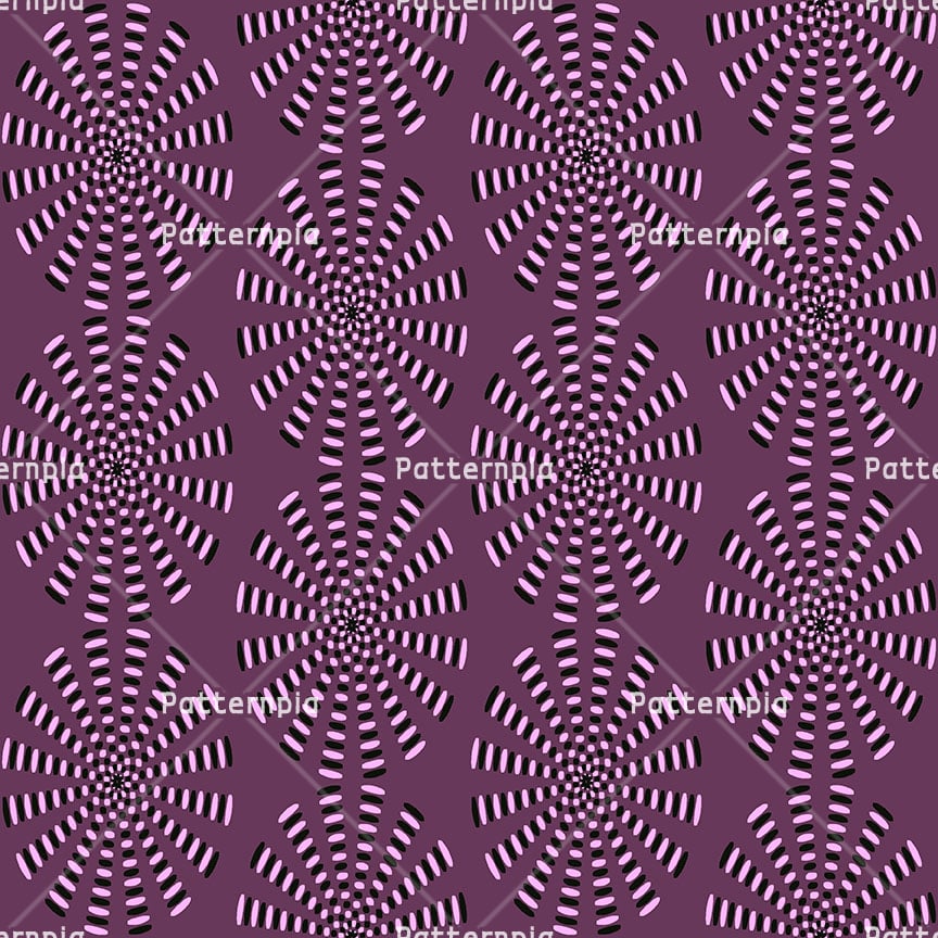 Hypnotic pink and black dotted radial bursts on plum ground.