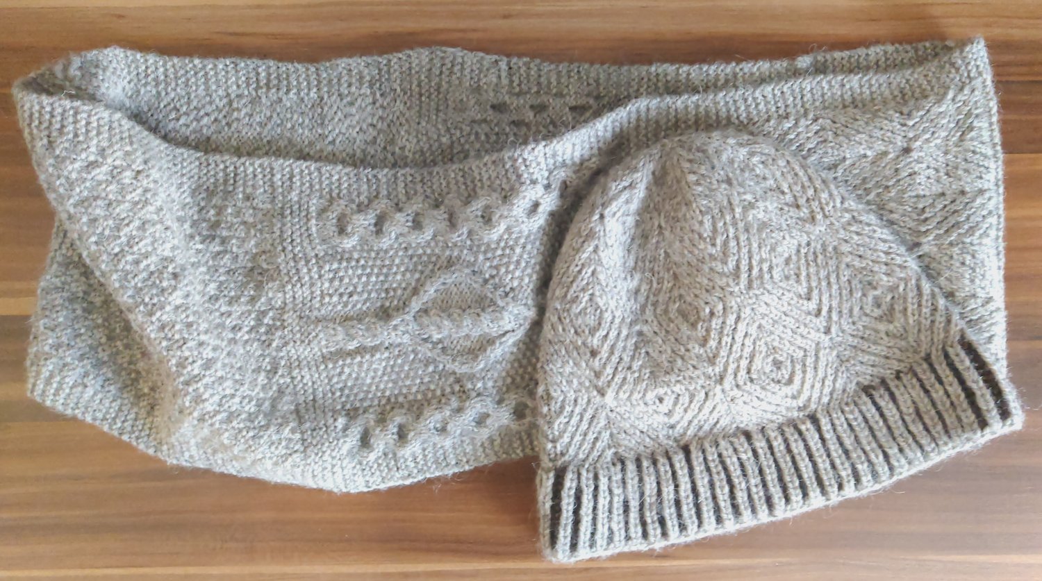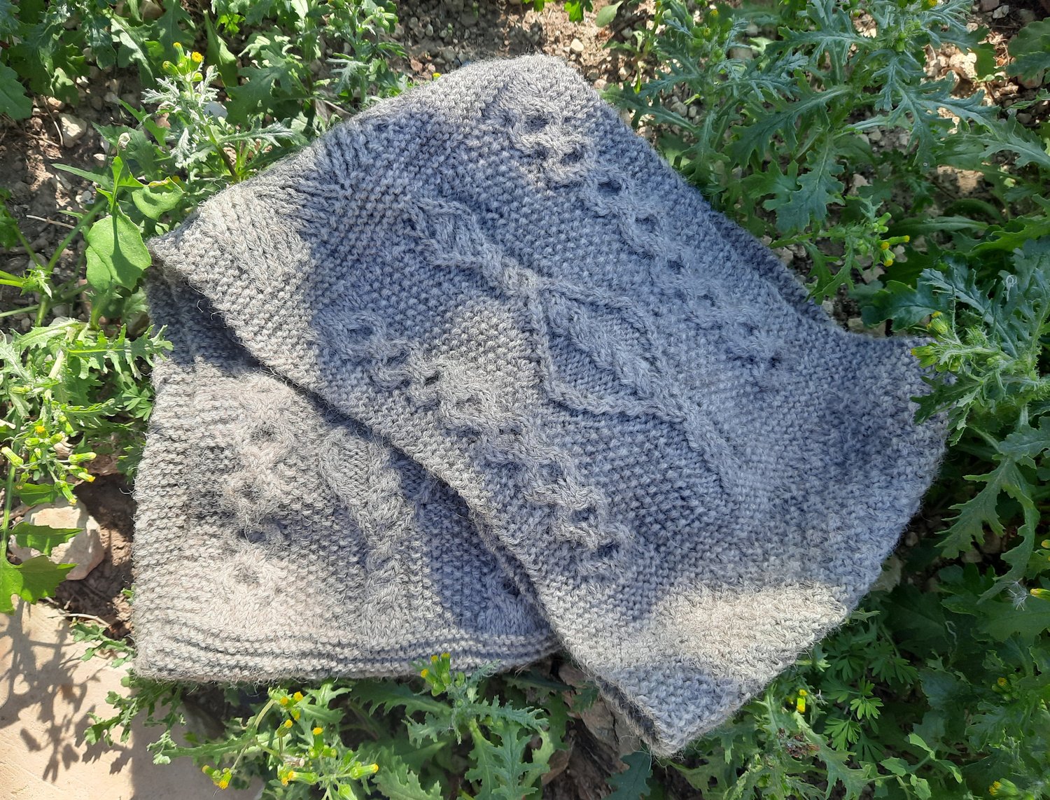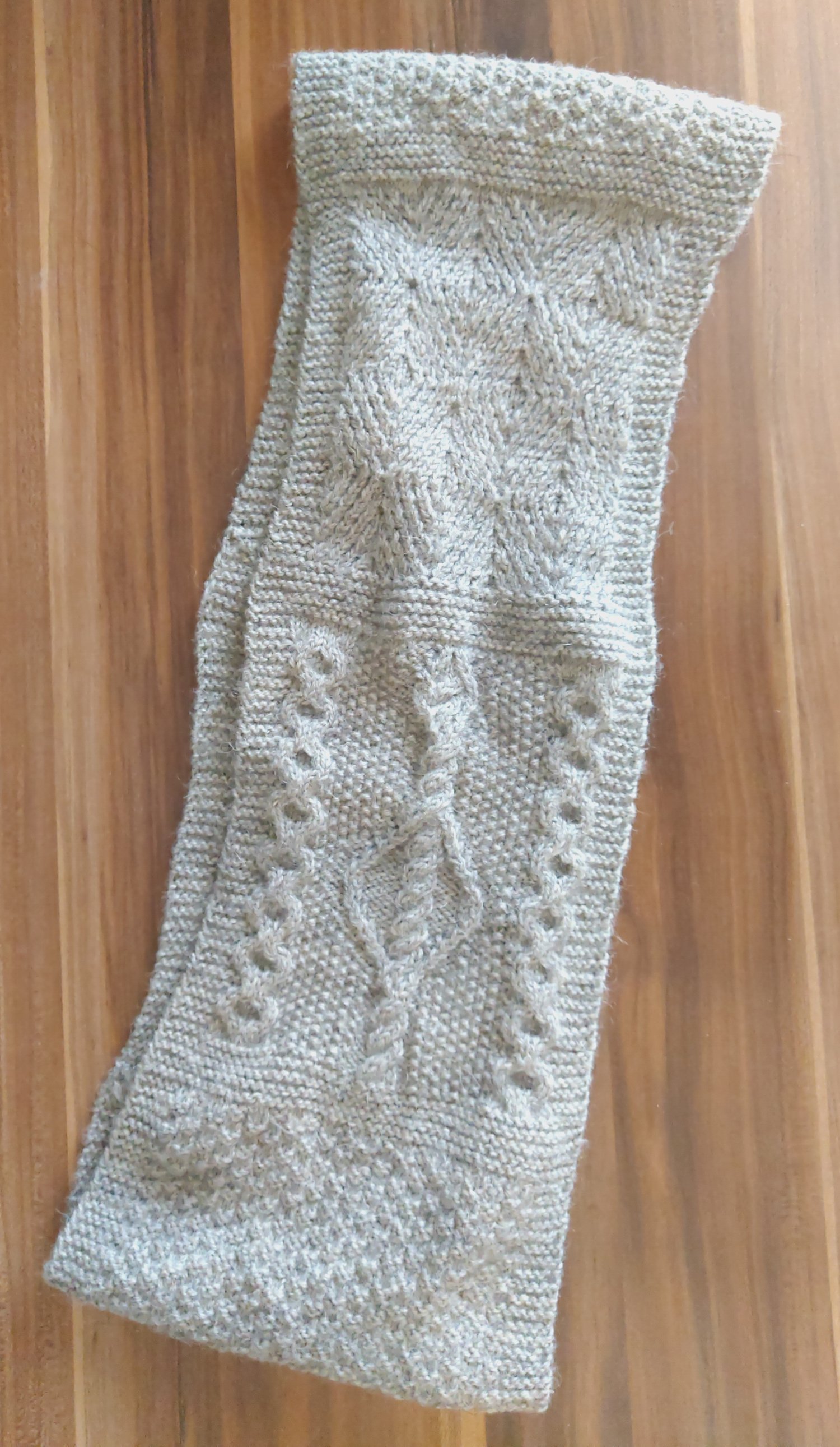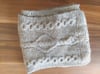 Beginning with a provisional cast on, this piece is knit flat, the charts worked through and then uses three-needle bind off to join it into a loop, hidden in a garter stitch section.
