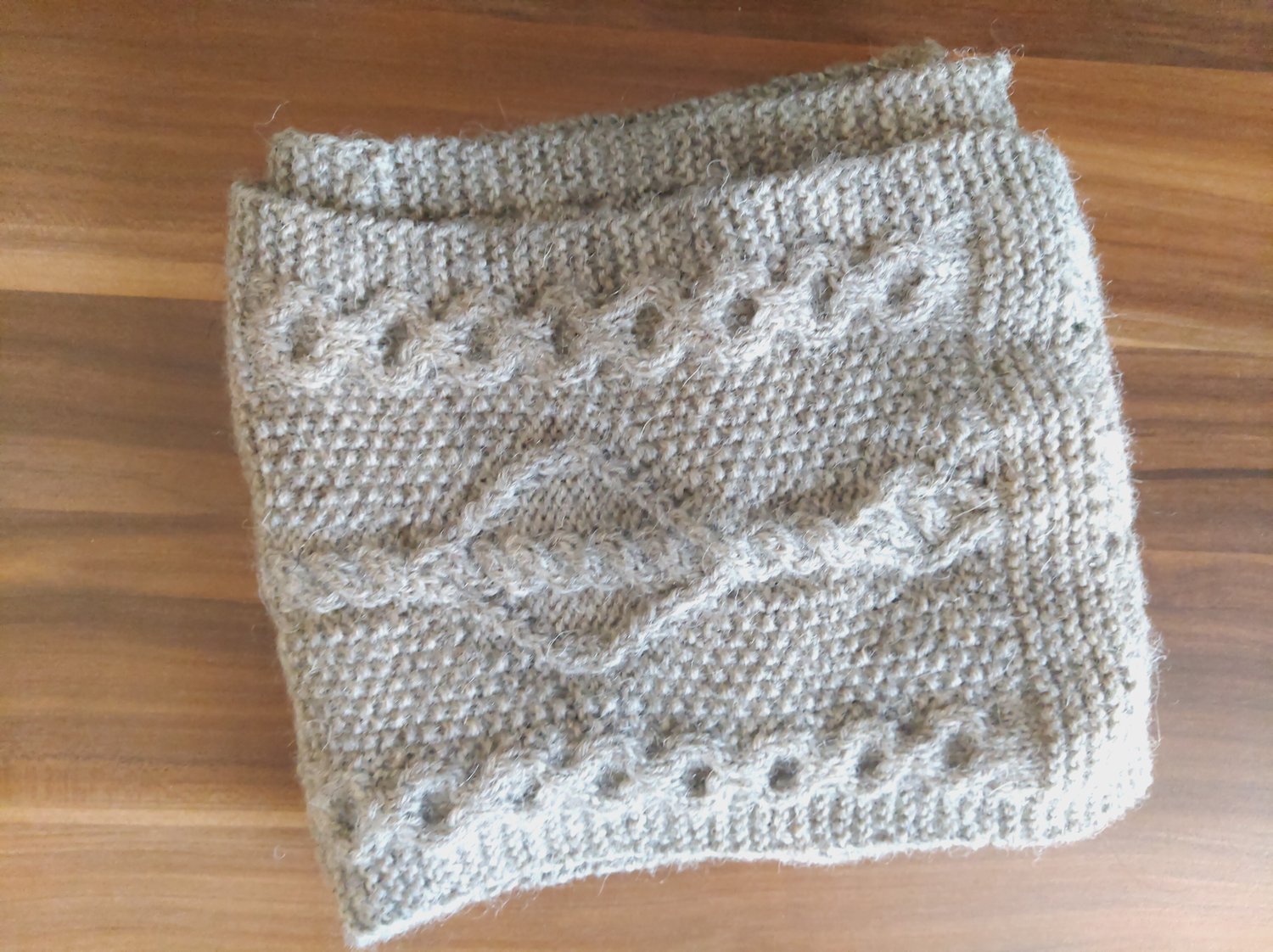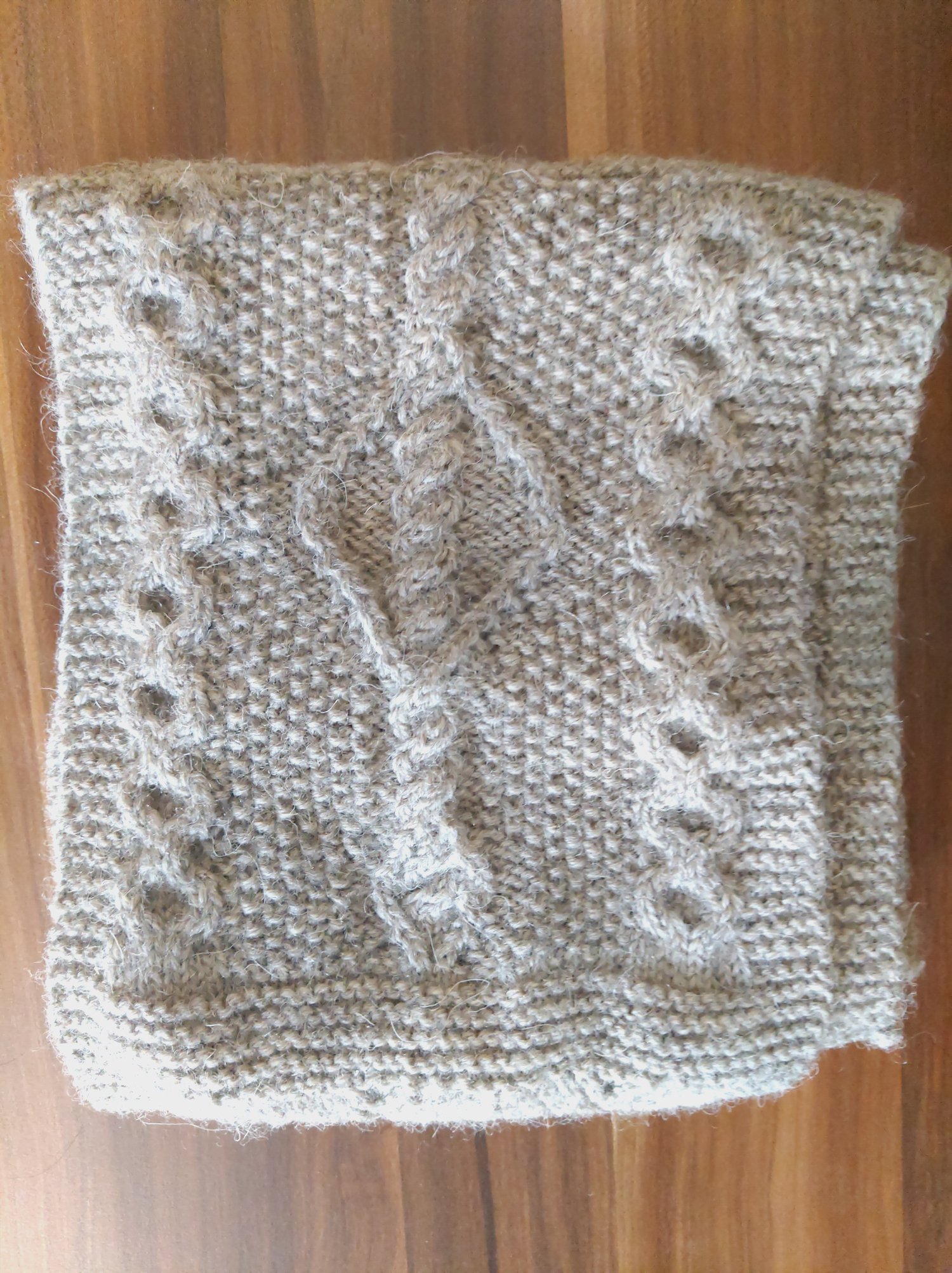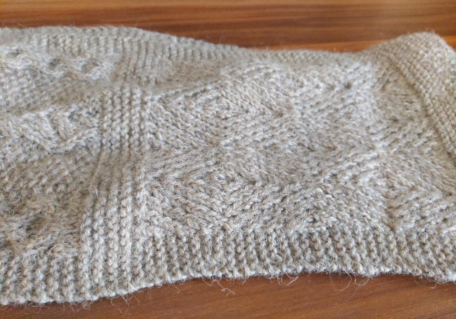 Beginning with a provisional cast on, this piece is knit flat, the charts worked through and then uses three-needle bind off to join it into a loop, hidden in a garter stitch section.