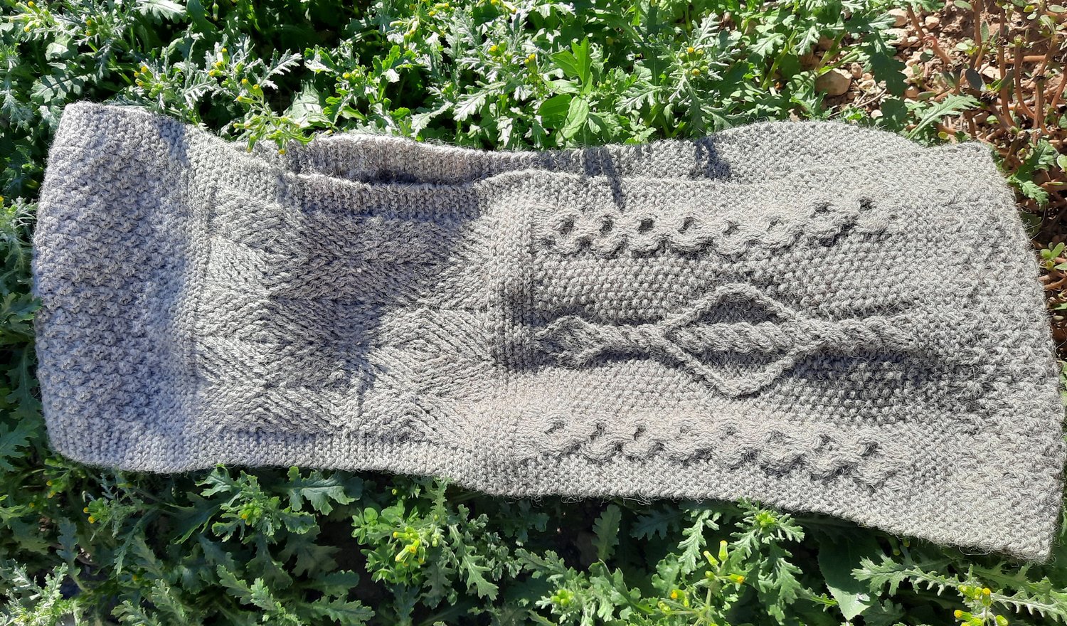 This cowl features twisted stitches and cables to add interest and texture to the knitting process, interspersed with seed stitch, moss stitch and bands of garter to give small frequent “restful” stitches to provide ease between them.