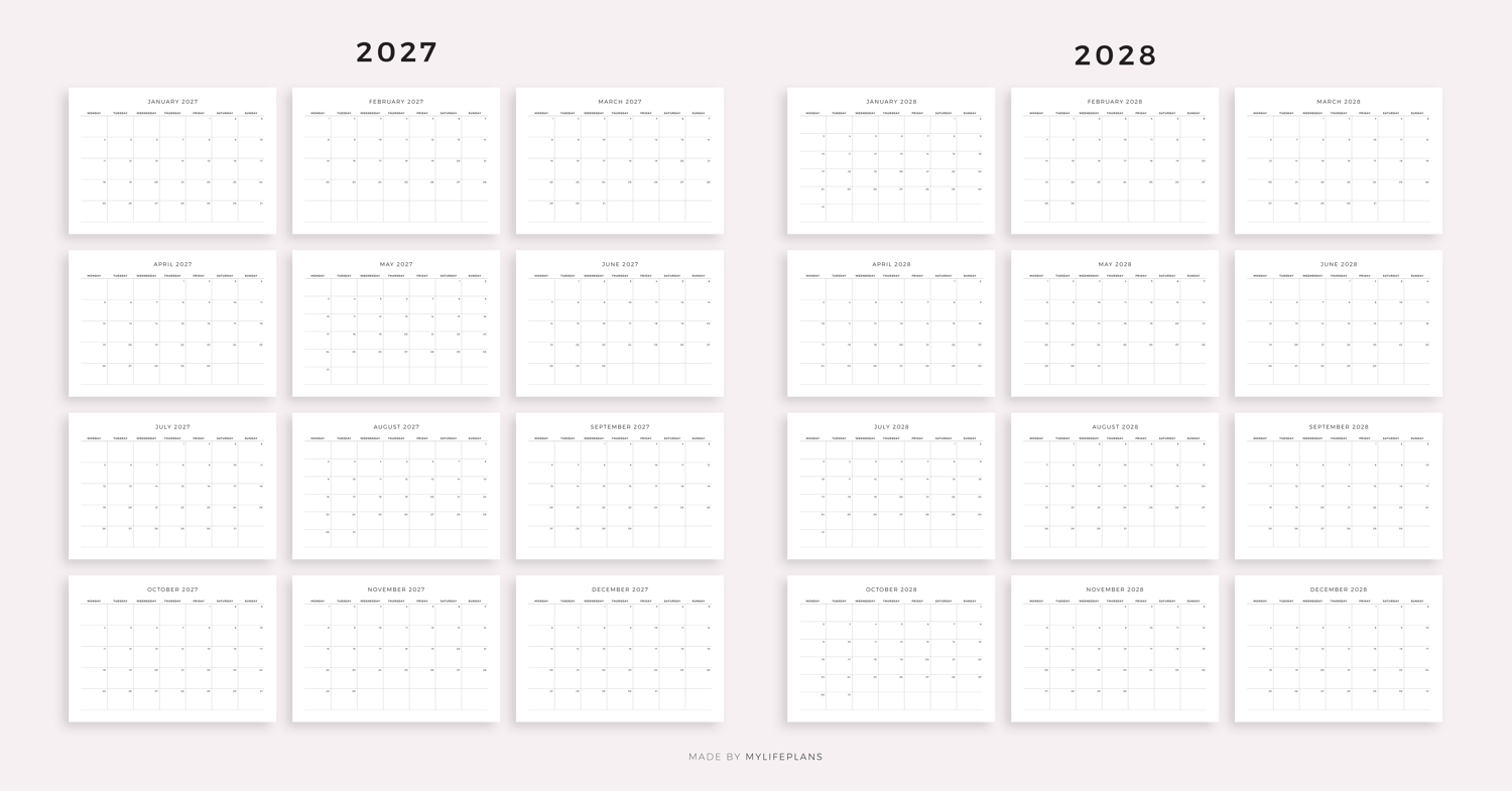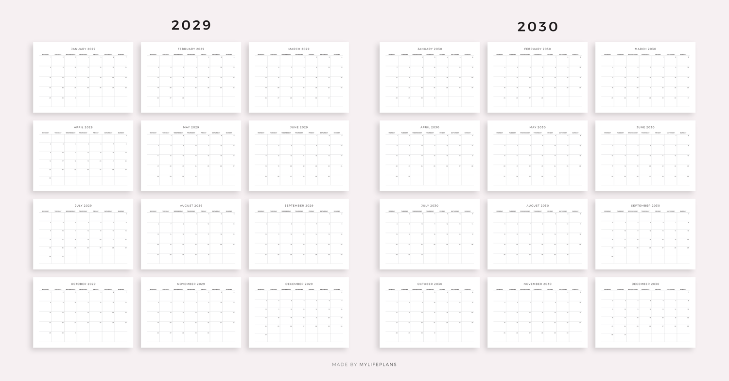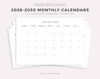 2026-2030 Monthly Calendars, Landscape, Printable & Fillable, A4/Letter Size