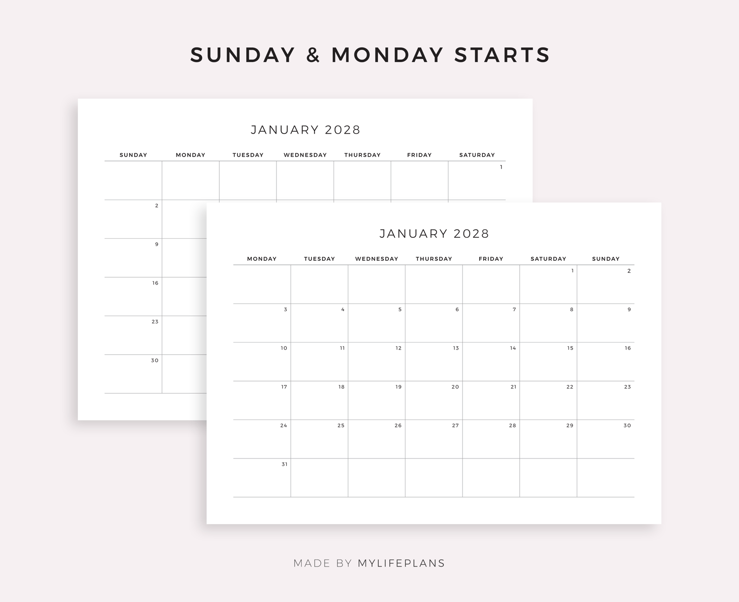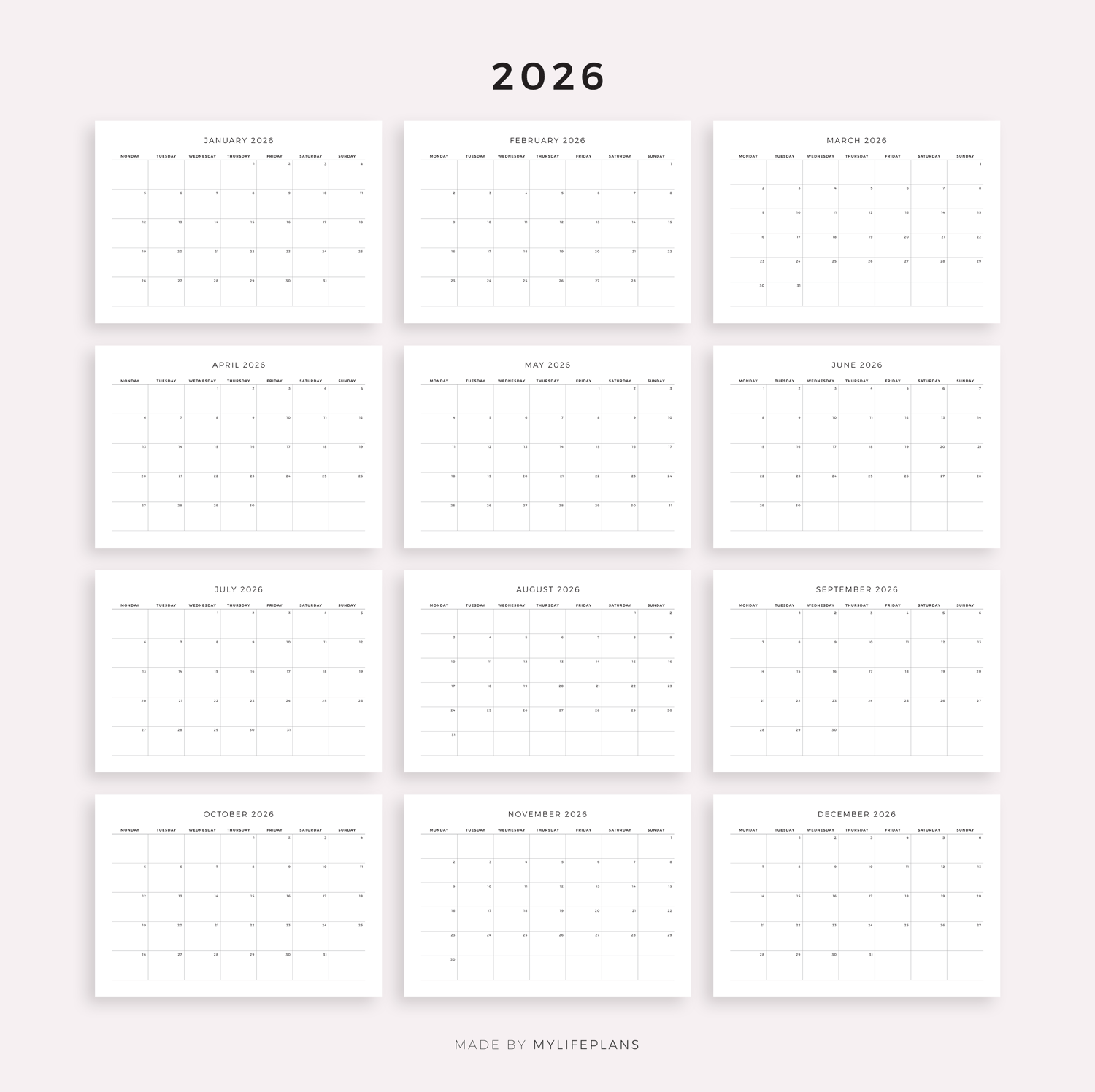 These are printable 2026–2030 monthly calendars — just download, print, and start using it right away.