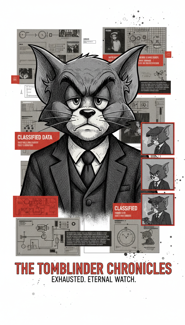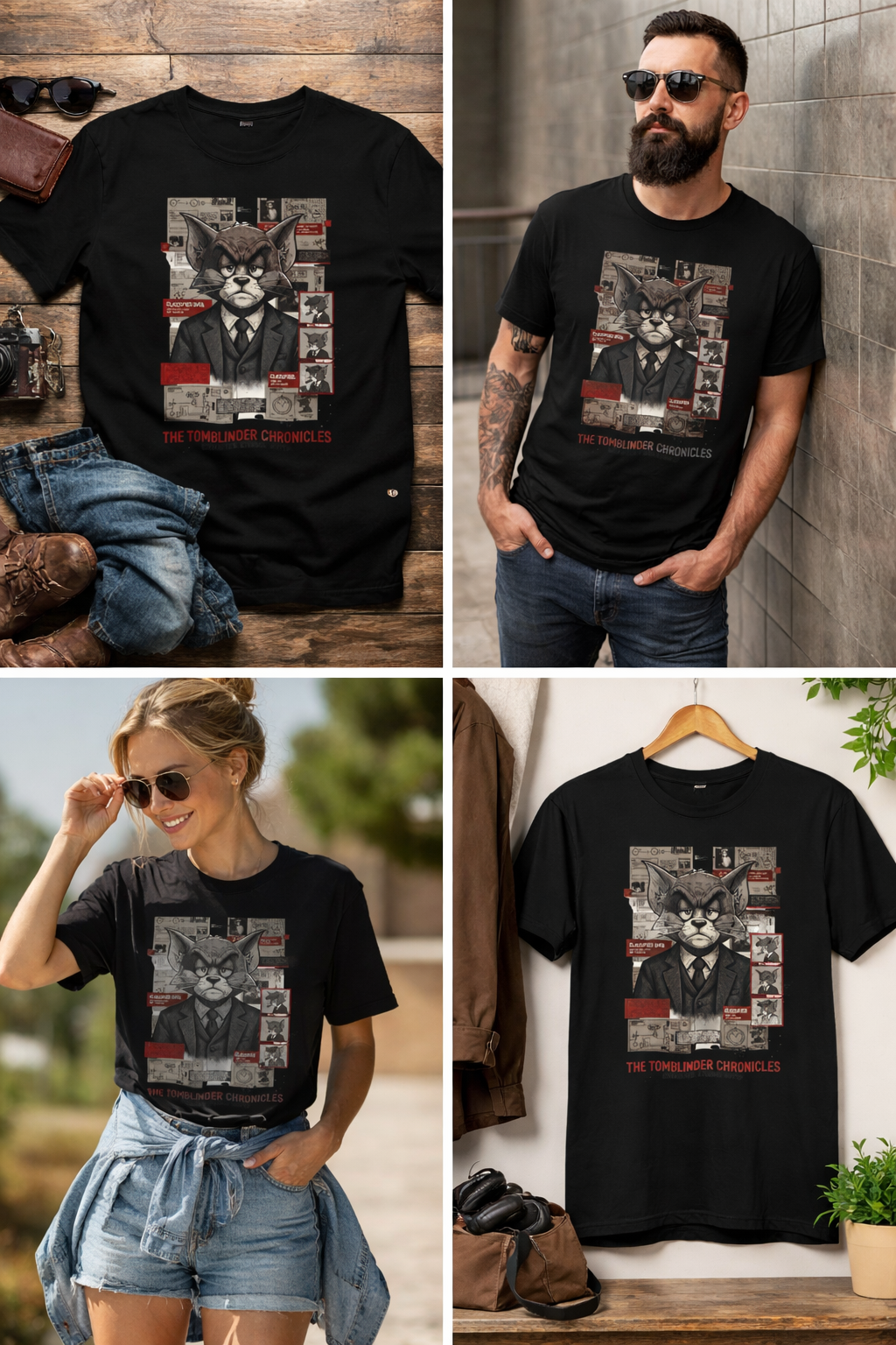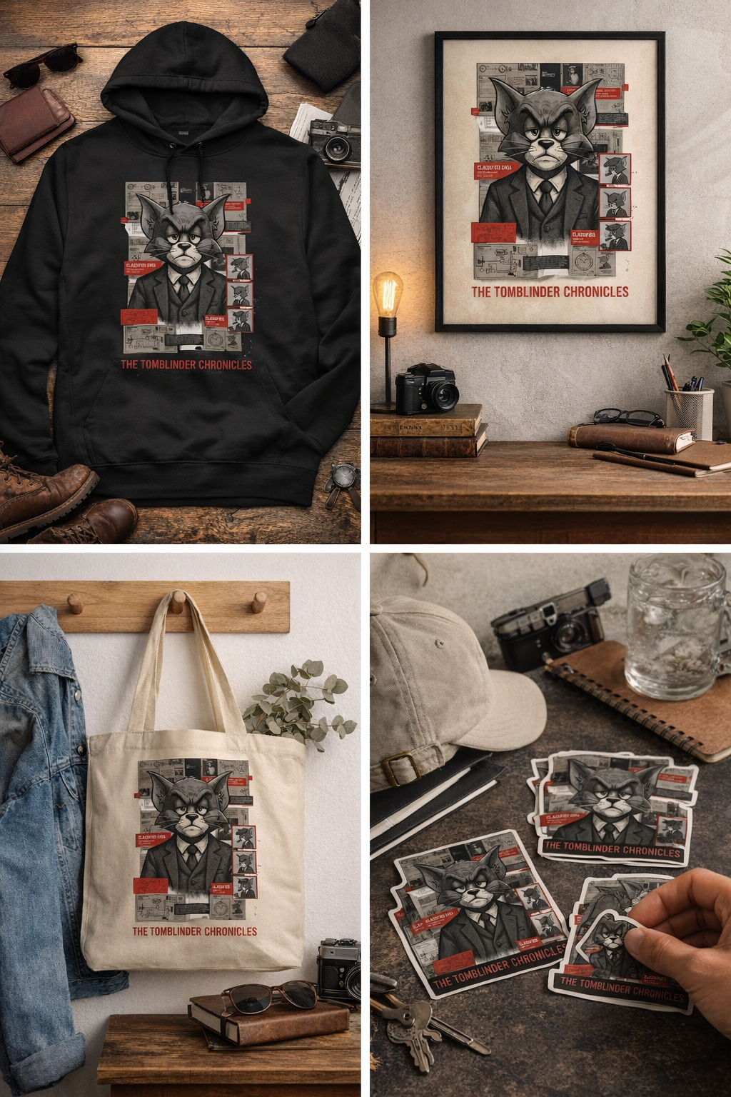 Tomblinder Chronicles captures the presence of a sharp, observant character set against layered investigative elements — a timeless aesthetic that blends vintage mystery with contemporary streetwear appeal.
