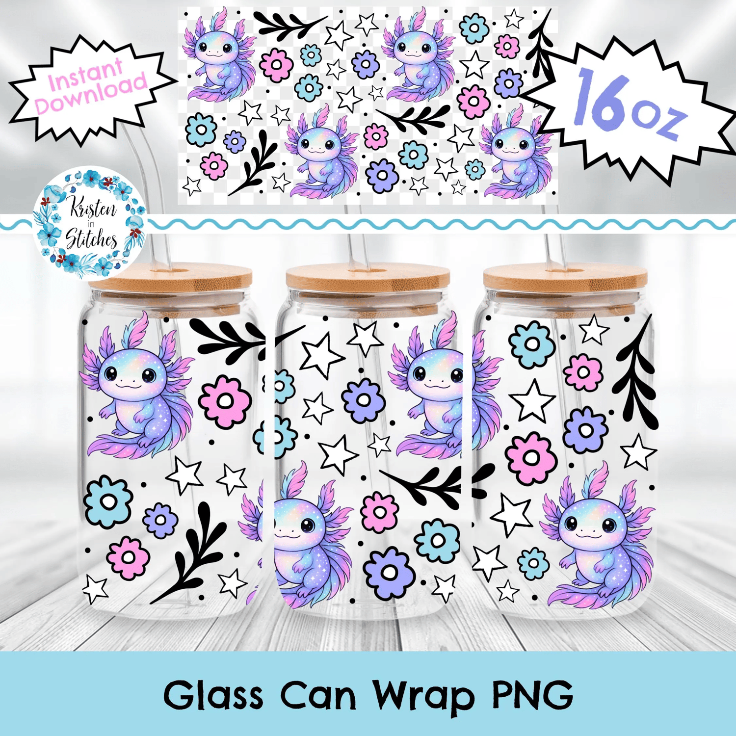 Baby Axolotls 16 oz Glass Can Wrap Transparent PNG, Pastel Floral