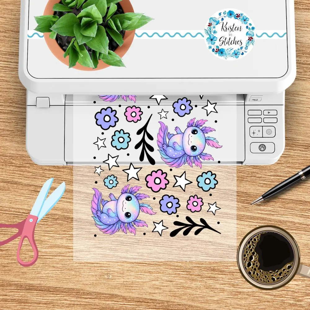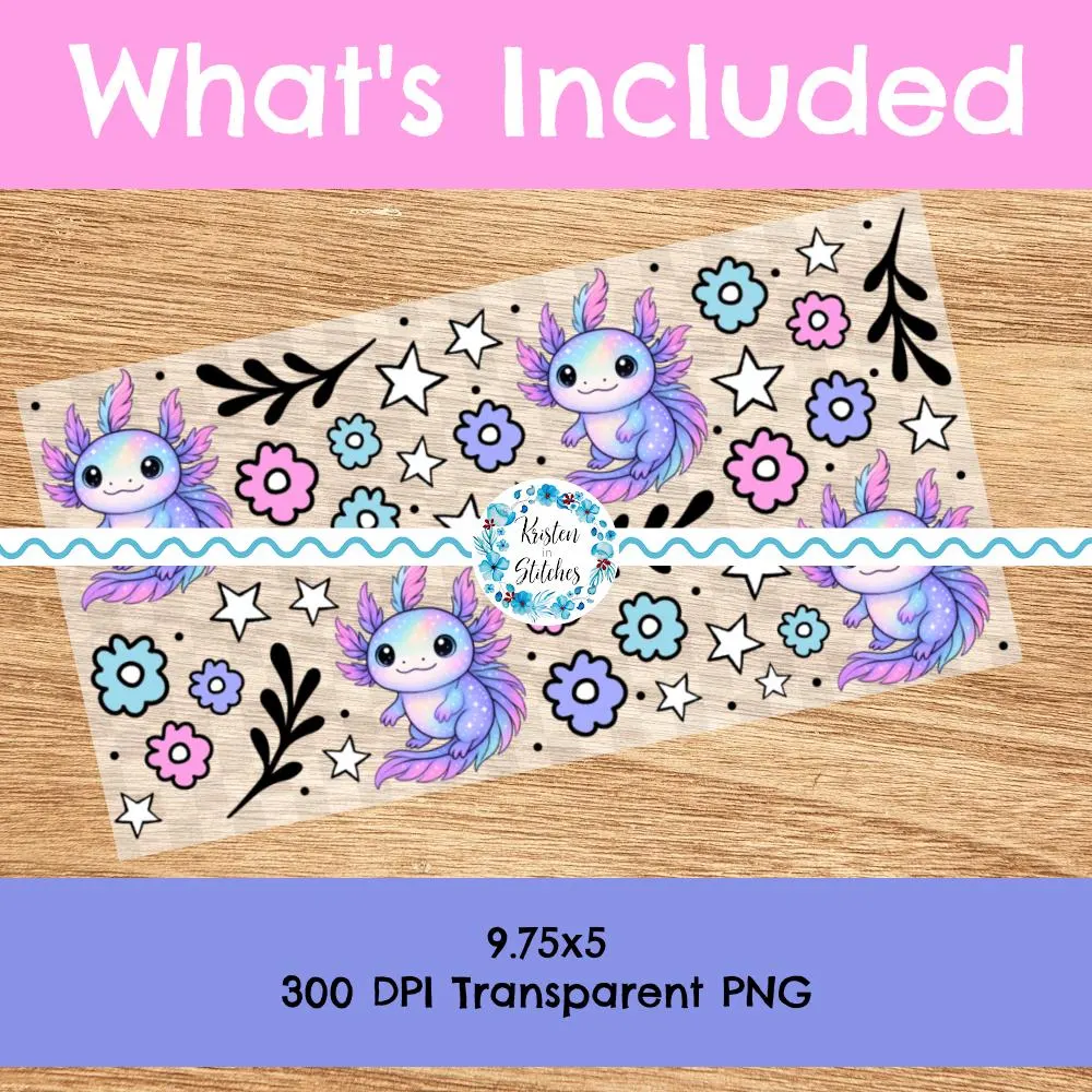 Features pretty pastel axolotl baby salamanders with flowers and stars.