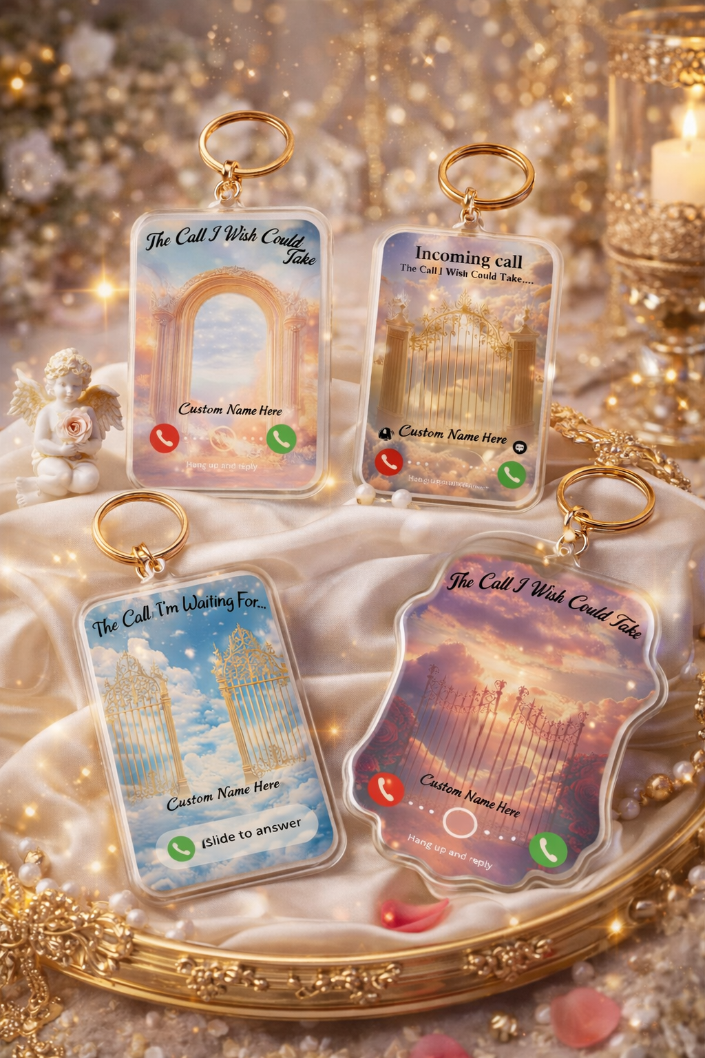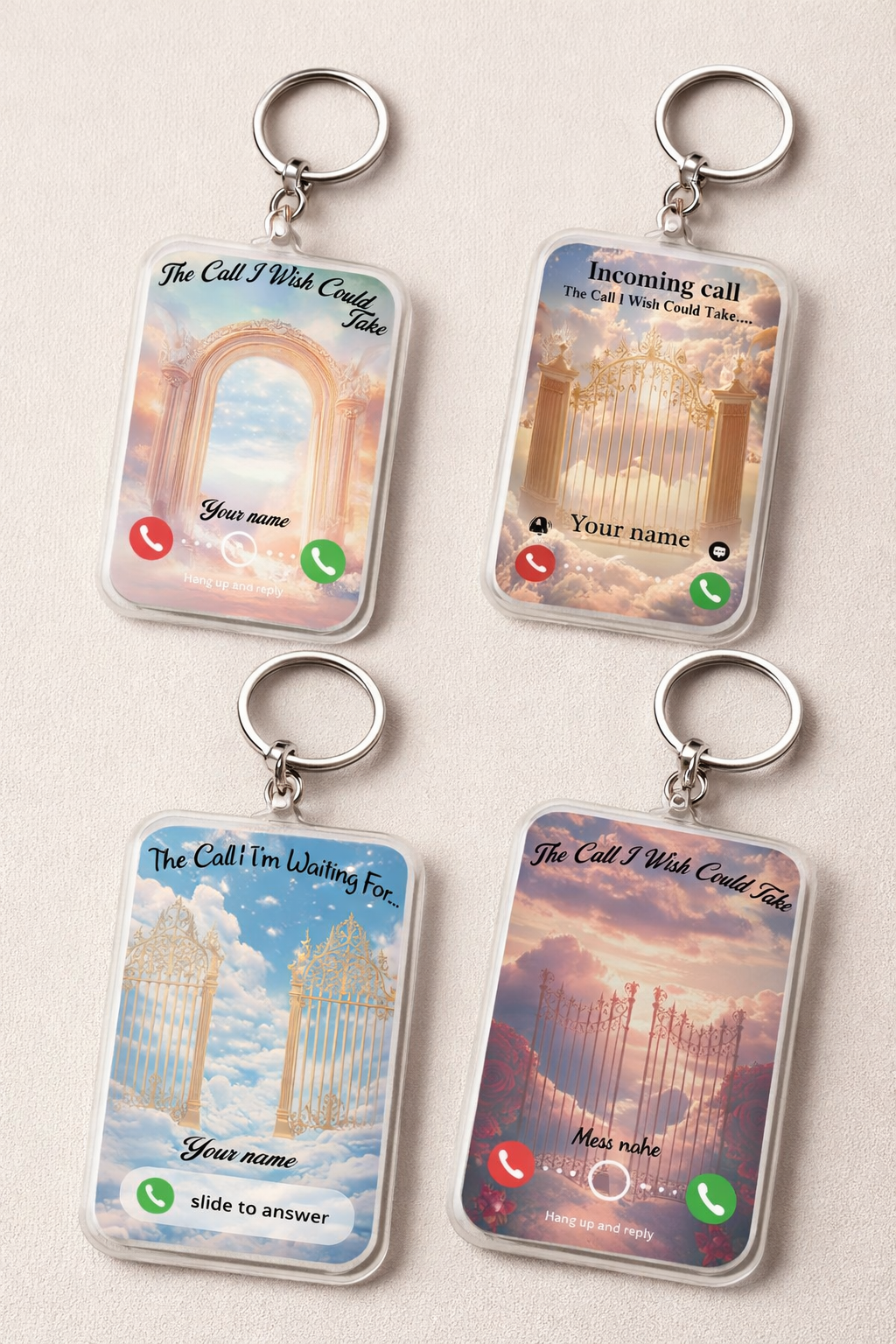 These designs feature soft heavenly gates, angelic skies, sunset clouds, and incoming call screen concepts that can be fully customized with your loved one’s name and details. Perfect for creating keepsake keychains that offer comfort and remembrance.