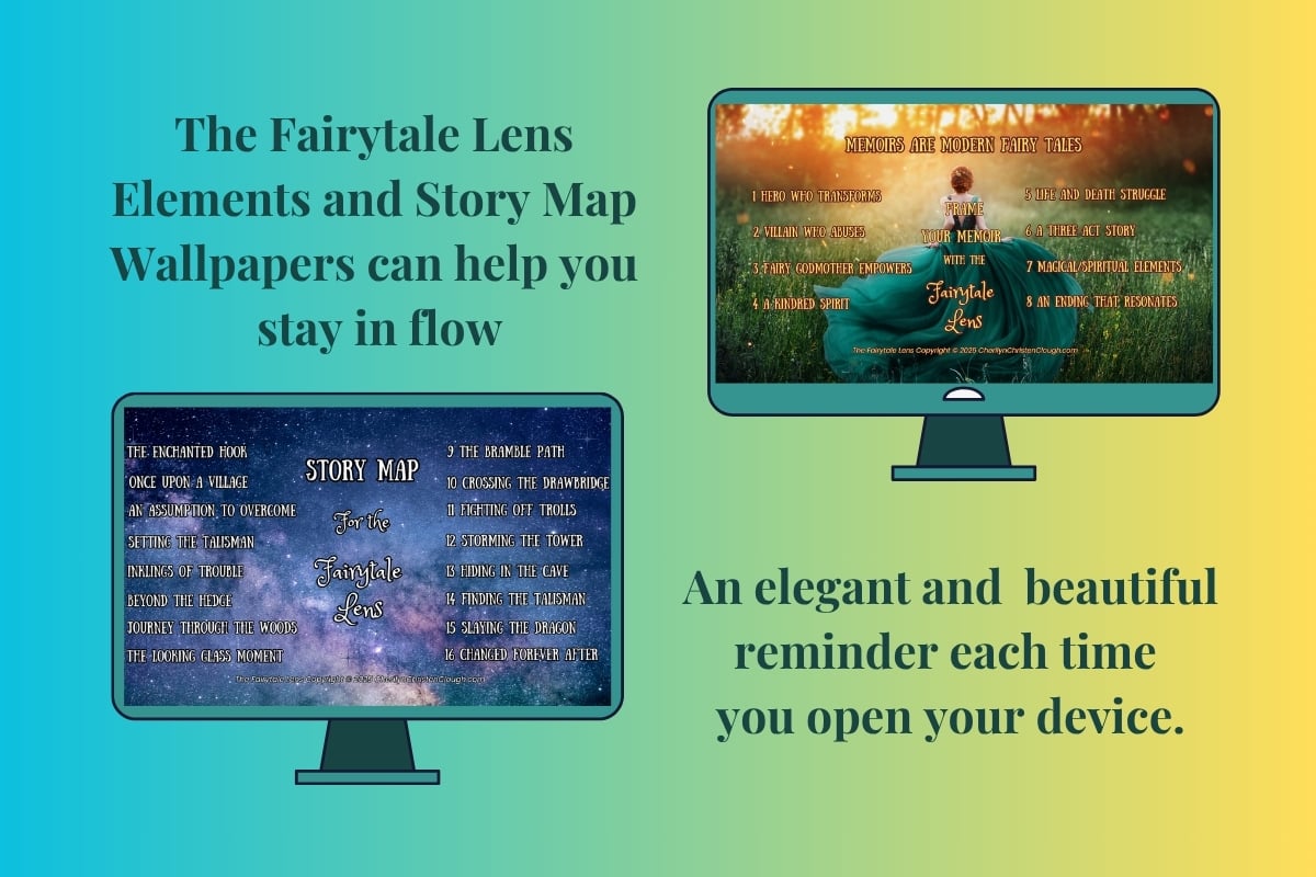The first wallpaper features the Eight Elements of the Fairytale Lens that can help your story resonate deeply with readers. This task is like an easter egg hunt to find the components that will make your story shine!