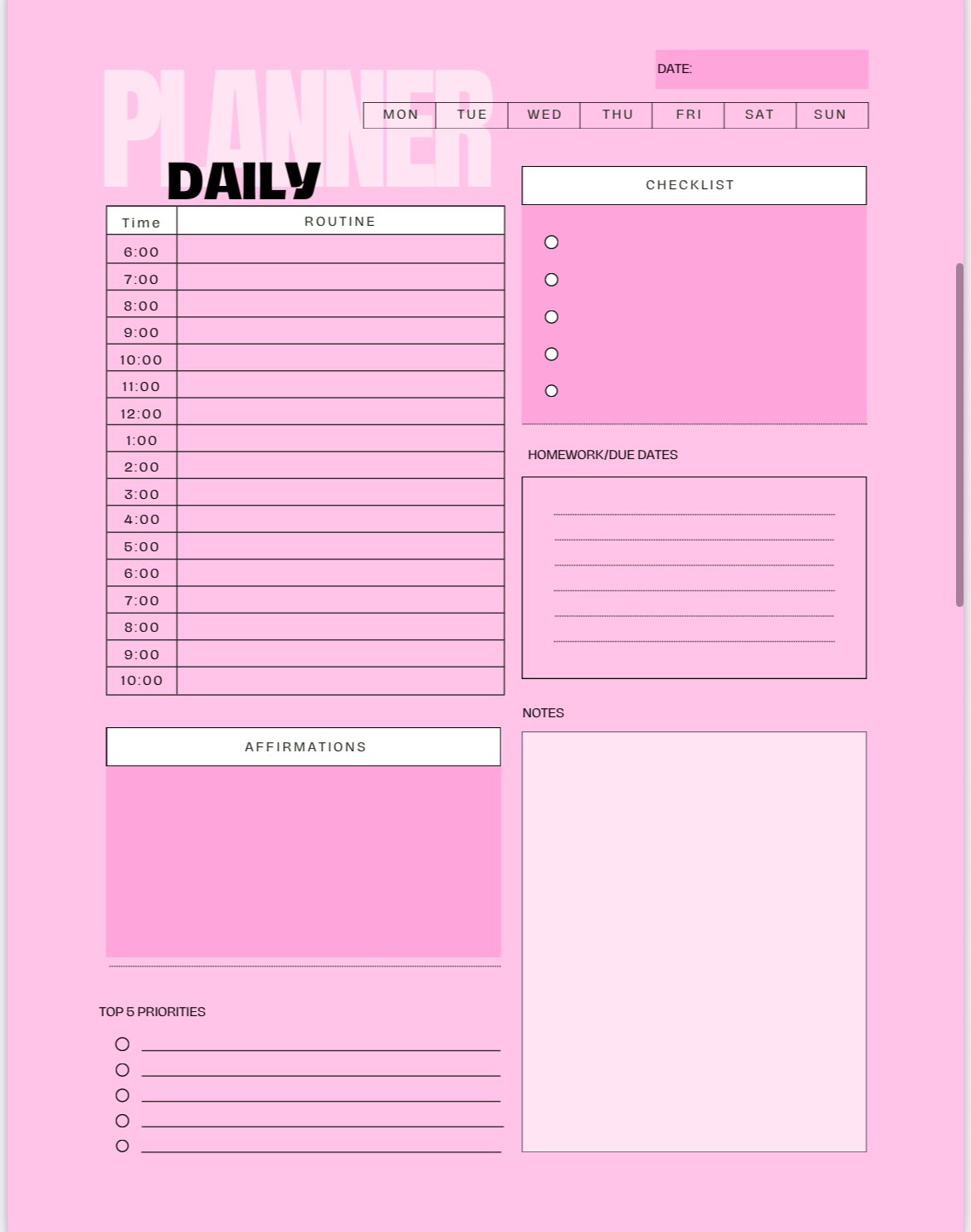 Daily Planner Pages → Space for top 5 priorities, homework lists, notes, and schedule.