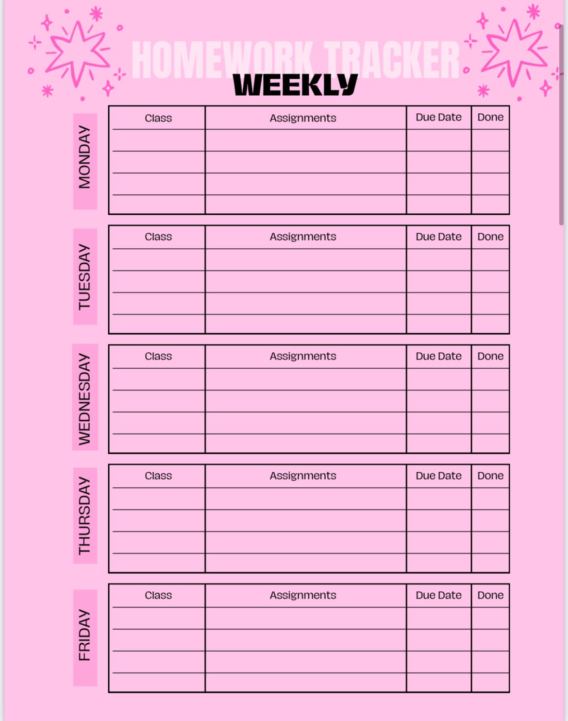 Weekly Homework Tracker → Track subjects, assignments, due dates, and completion.
