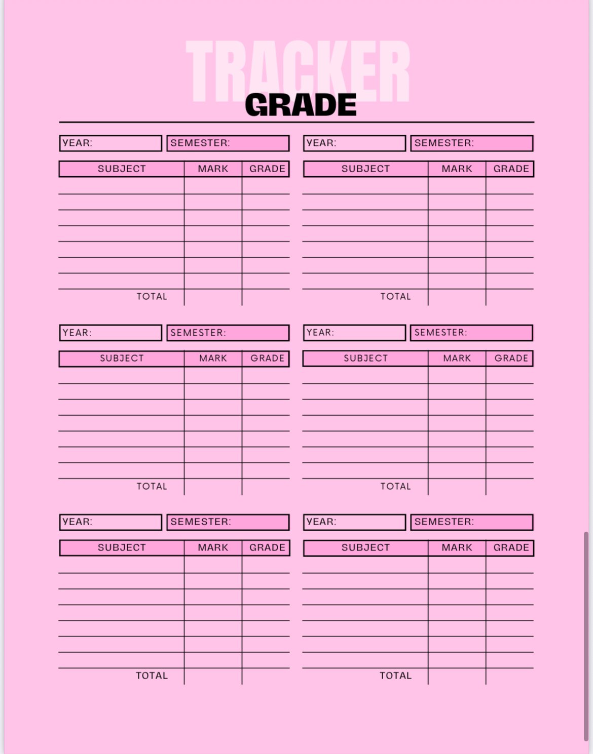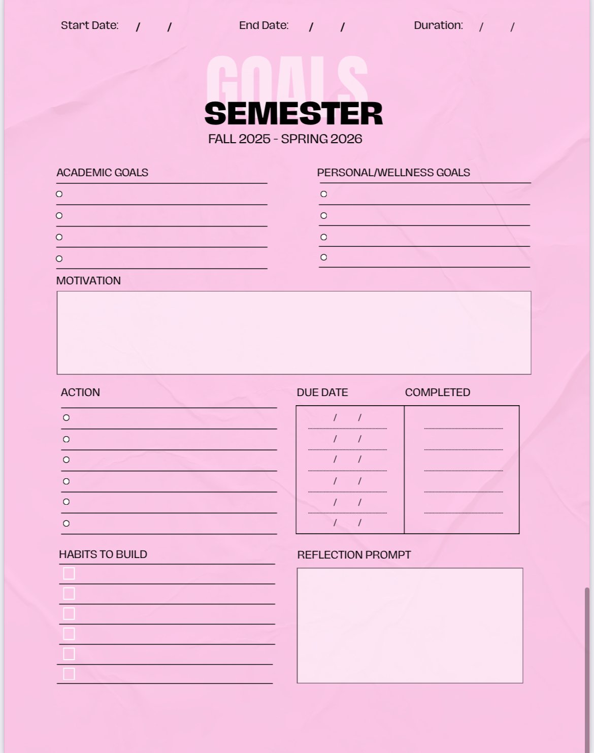 Goals for the Semester → Write out academic + personal goals, habits to build, and progress check-ins.