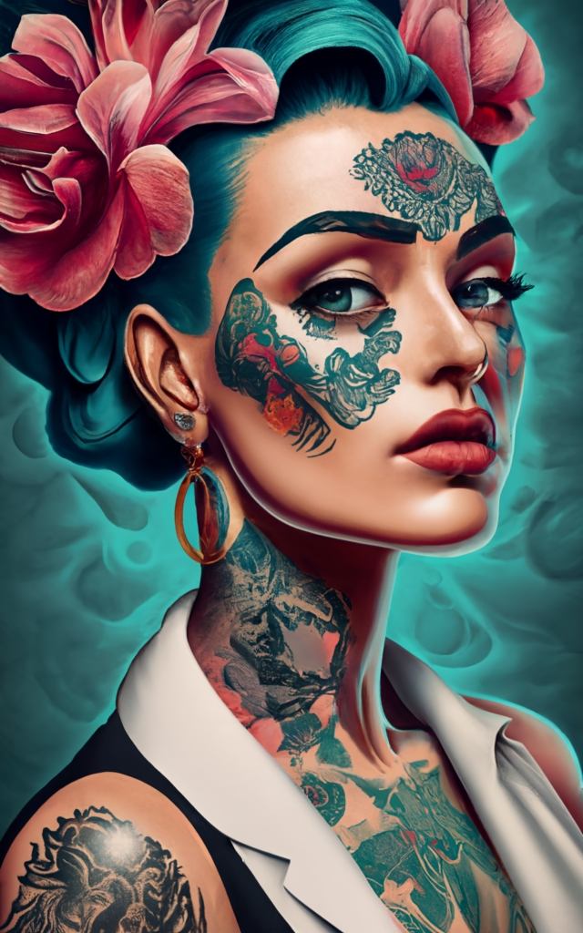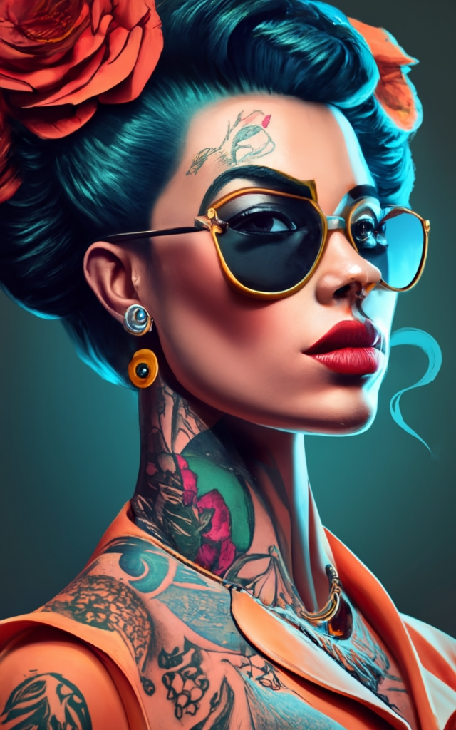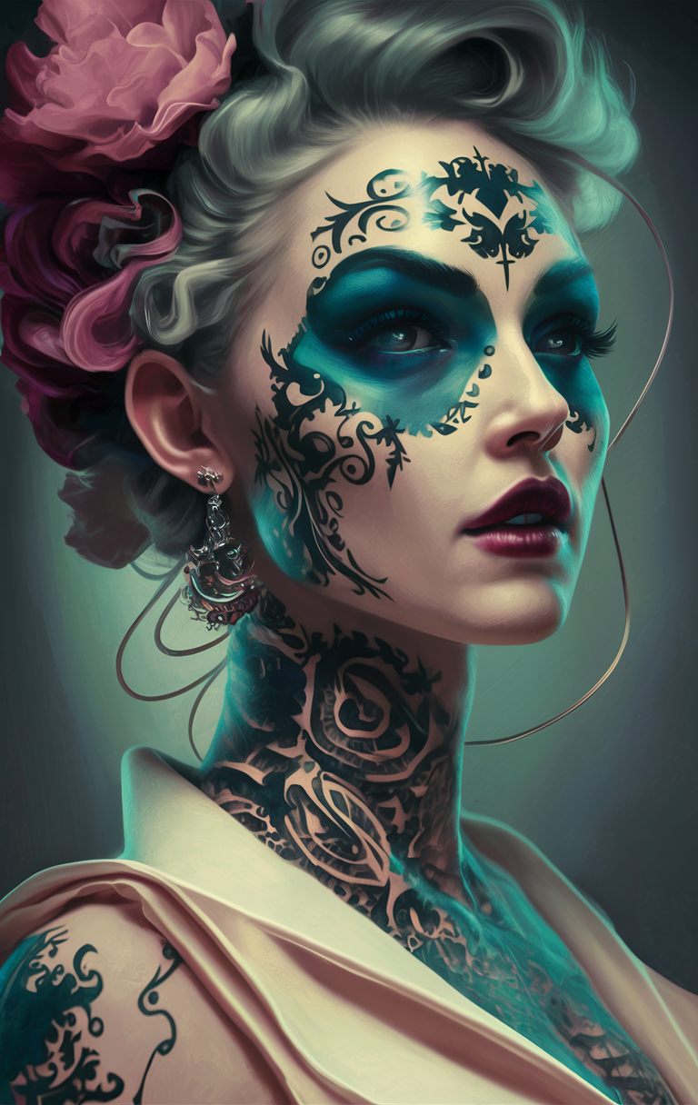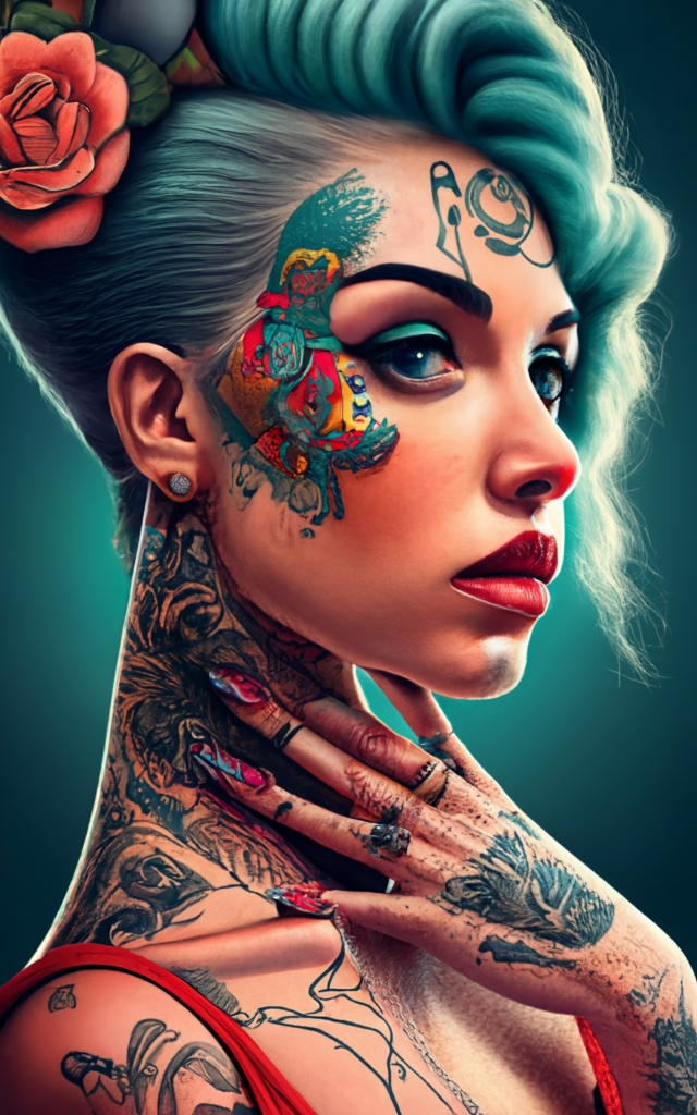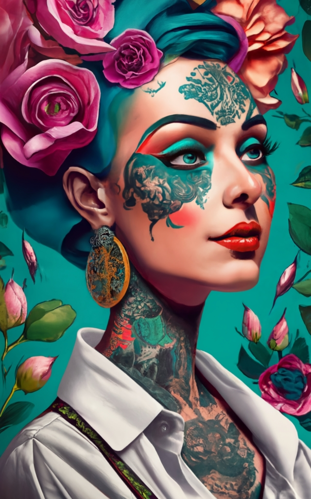 A tattooed pinup girl, stylized from a mashup of women's Victorian era clothing and 1960's era.