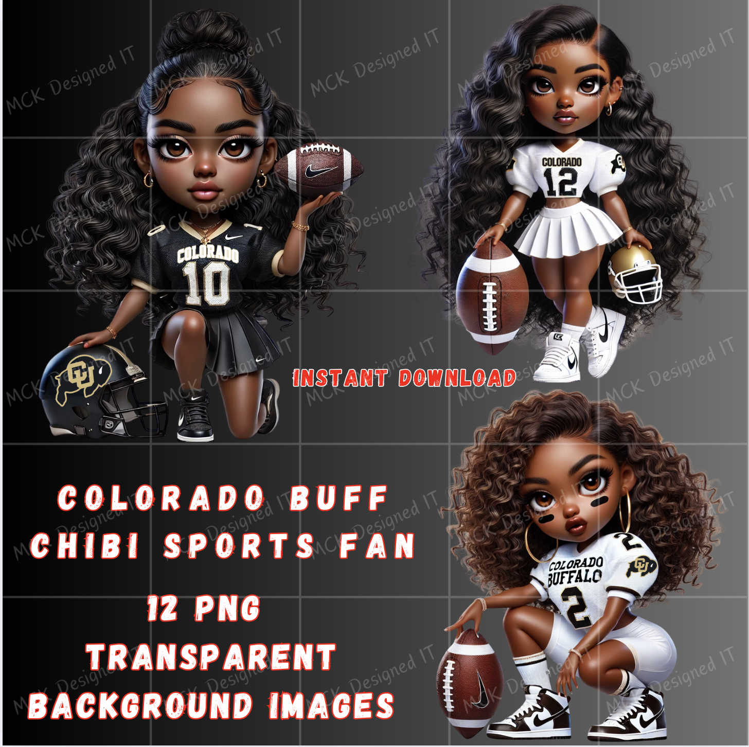 Show your Colorado Buff pride with this Chibi Sports Fan PNG bundle! This collection features 12 high-resolution transparent PNG images of adorable, confident chibi-style fans dressed in Colorado-inspired football outfits โ full of team spirit, curls, and attitude. Perfect for sports merch, fan art, apparel, and digital designs that celebrate game-day energy and Black girl magic!