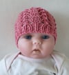 This soft and pretty Beanie is worked in a lovely but simple lace stitch and has a rib brim. The crown shaping rows are written out for you, to help keep the lace stitch going correctly.