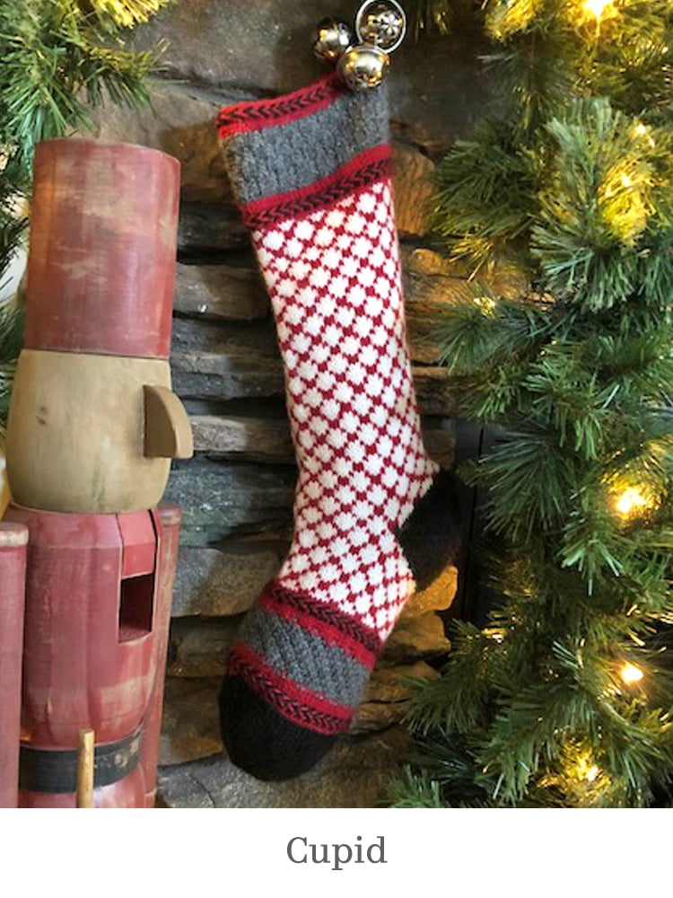 We like to use four colours in our stockings. If you'd like to use up stash yarn, you'll need approximately: 50g for Colours A and B and 100g for Colours C and D of a worsted weight yarn.