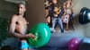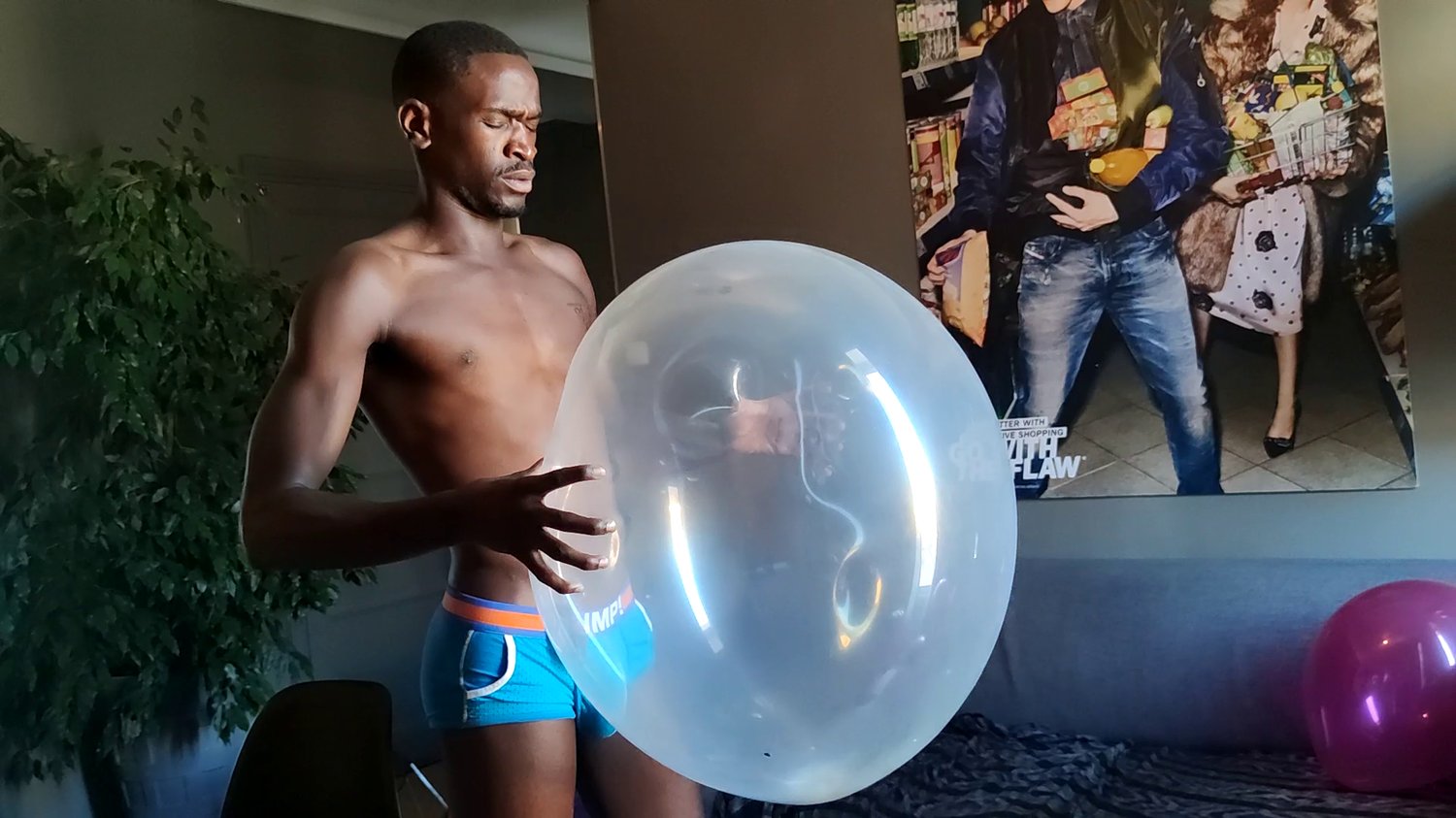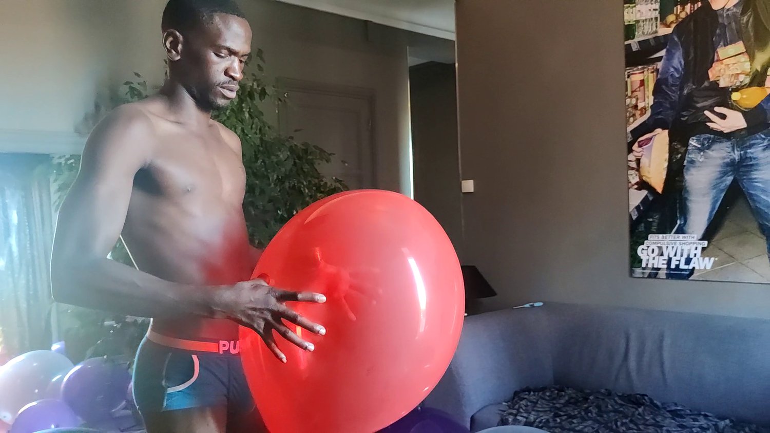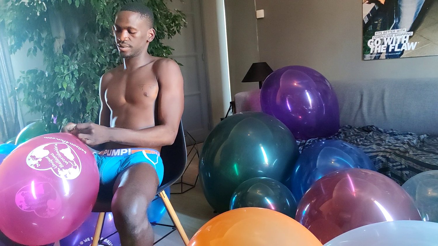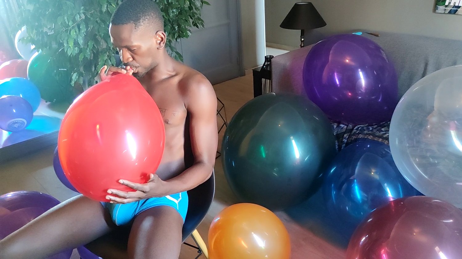 He start by blowing 7 balloons. After that he hand pop a lot of balloons.