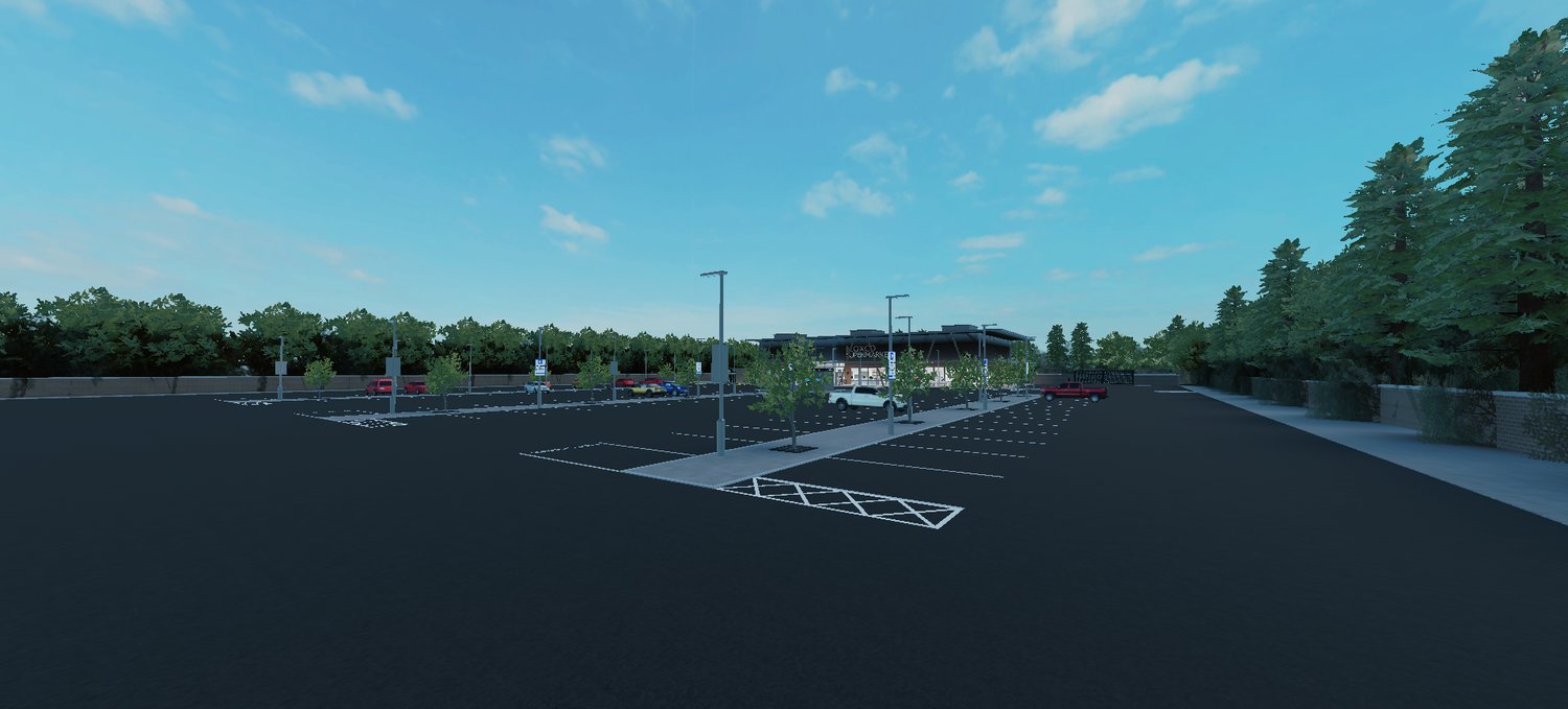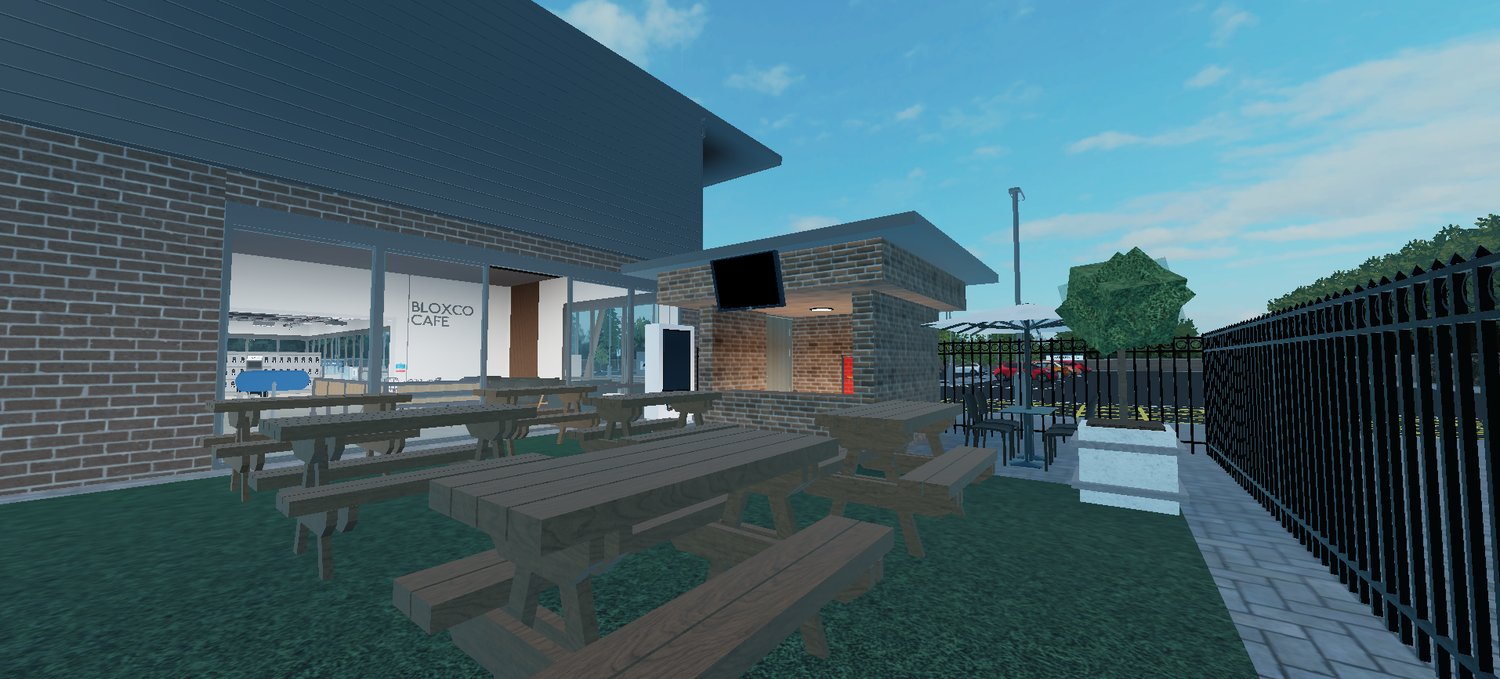 - Branded Exterior – modern “Bloxco Supermarket” building with parking lot and signage