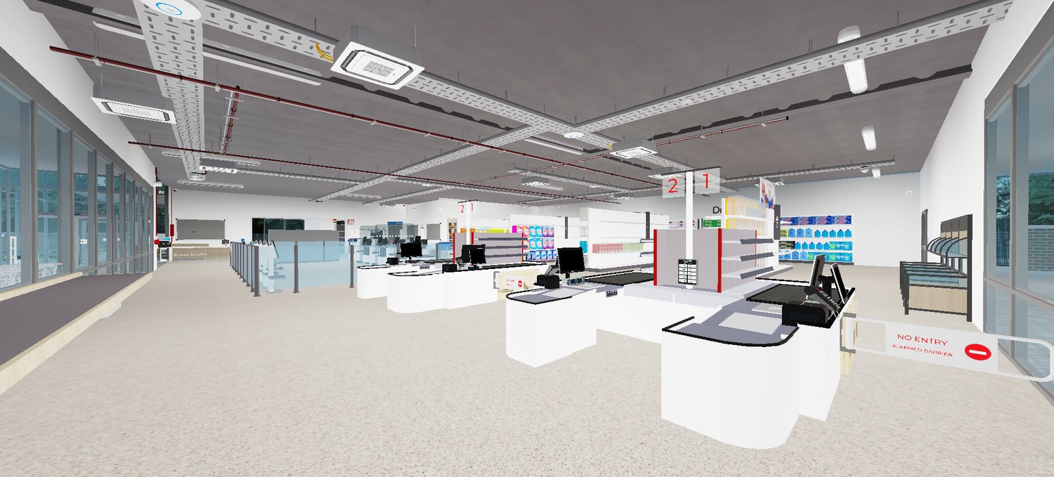 - Customer Service Desks – signage and counters for checkout and support roleplay