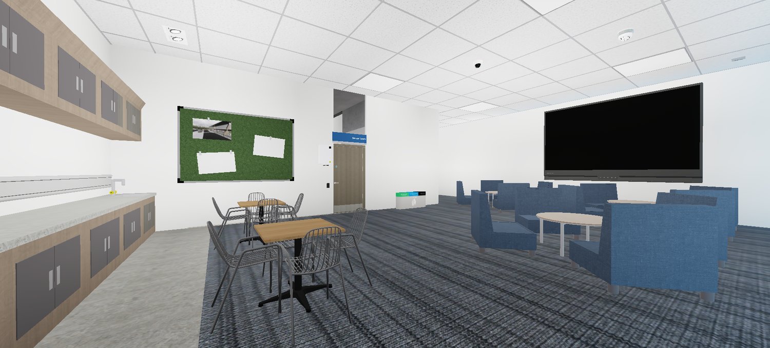 - Staff Lounge & Waiting Area – blue chairs, tables, and “Staff Only” access