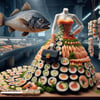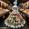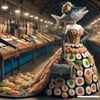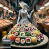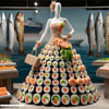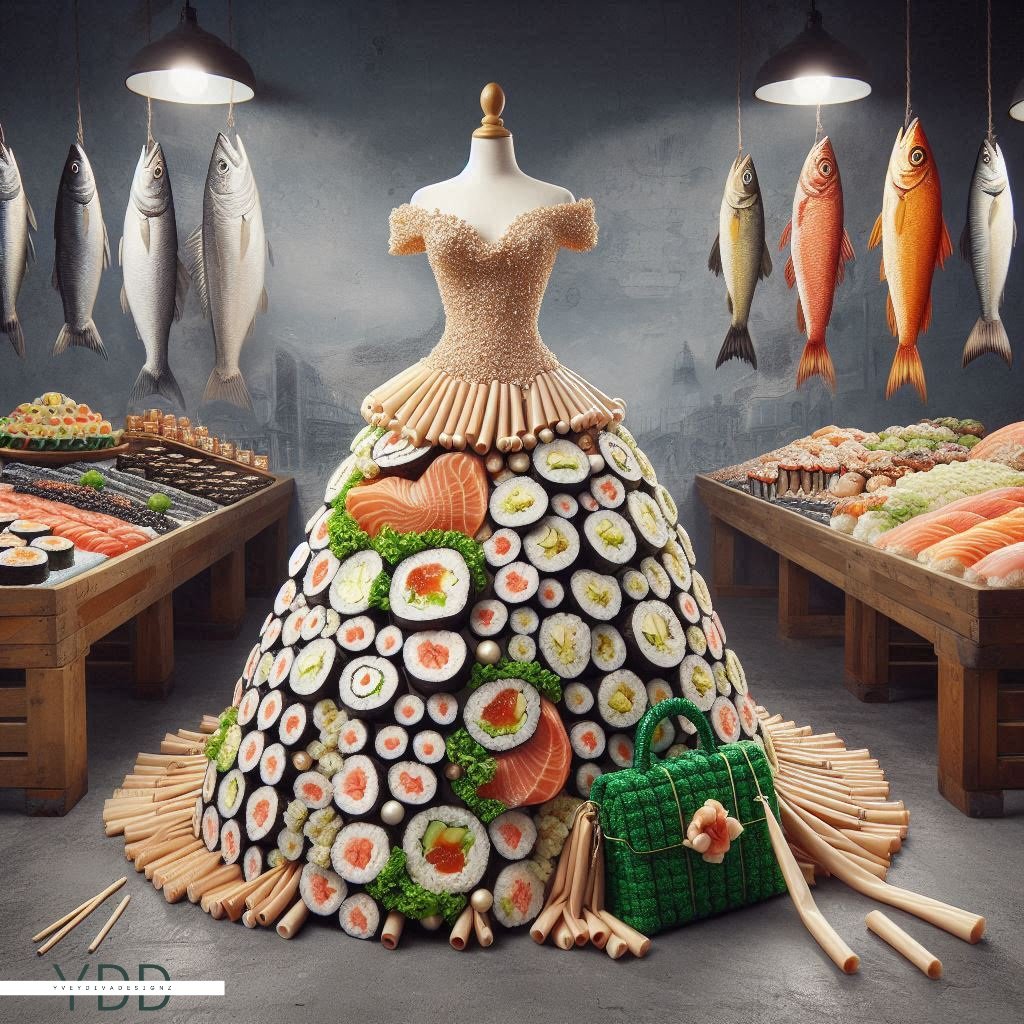 A daring couture gown crafted entirely from sushi, draped elegantly on a mannequin with a striking fish head. Complemented by a handbag fashioned from sushi-inspired elements, this avant-garde creation blends high fashion with culinary artistry, making a bold statement of creativity and luxury.