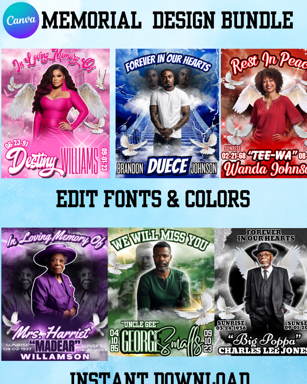 This is a digital download. You will receive 6 Editable Canva Templates. Add your own custom personalization to remember and memorialize designs that gives timeless memories.