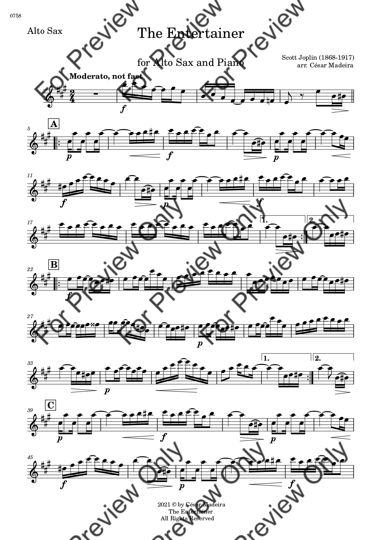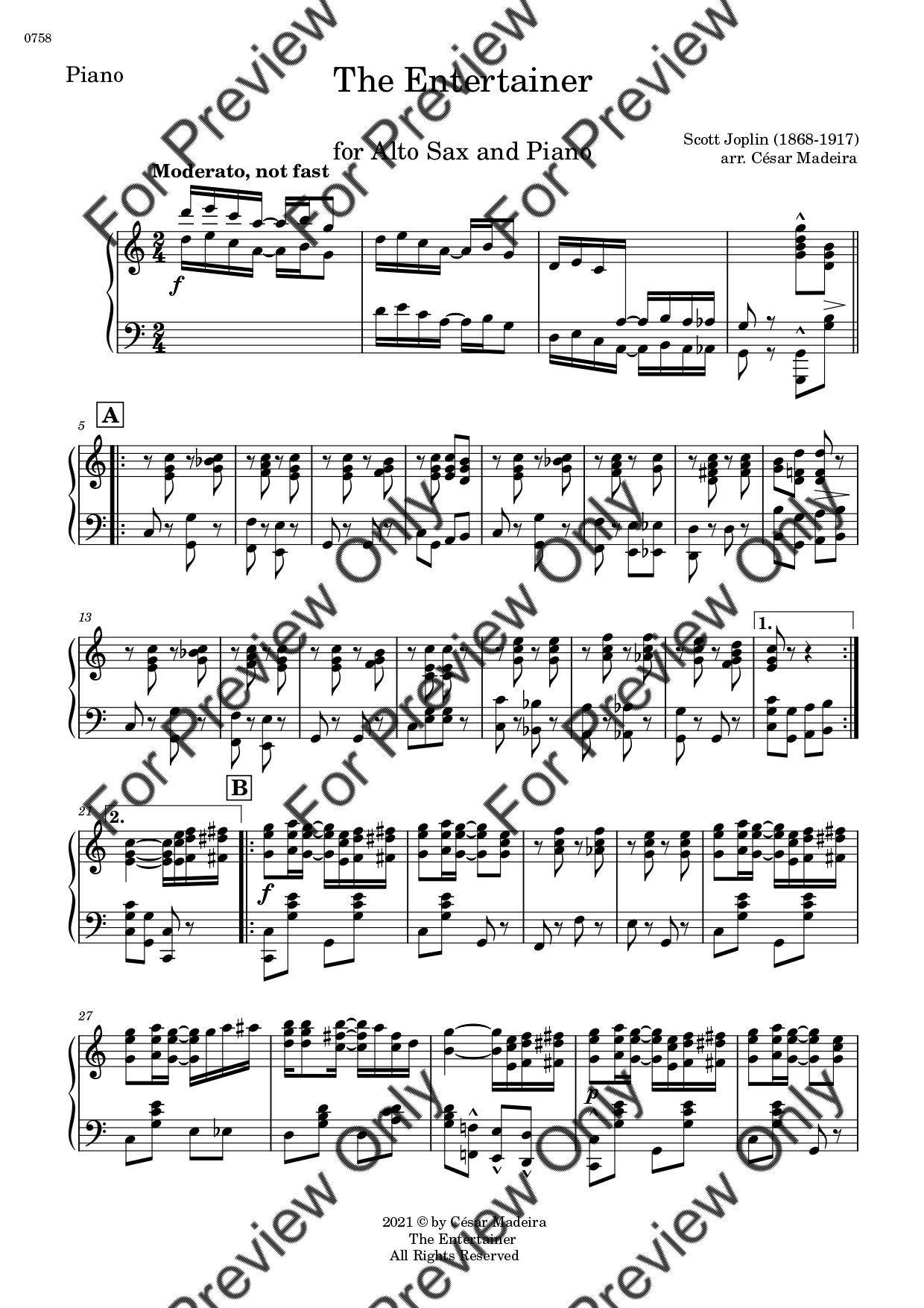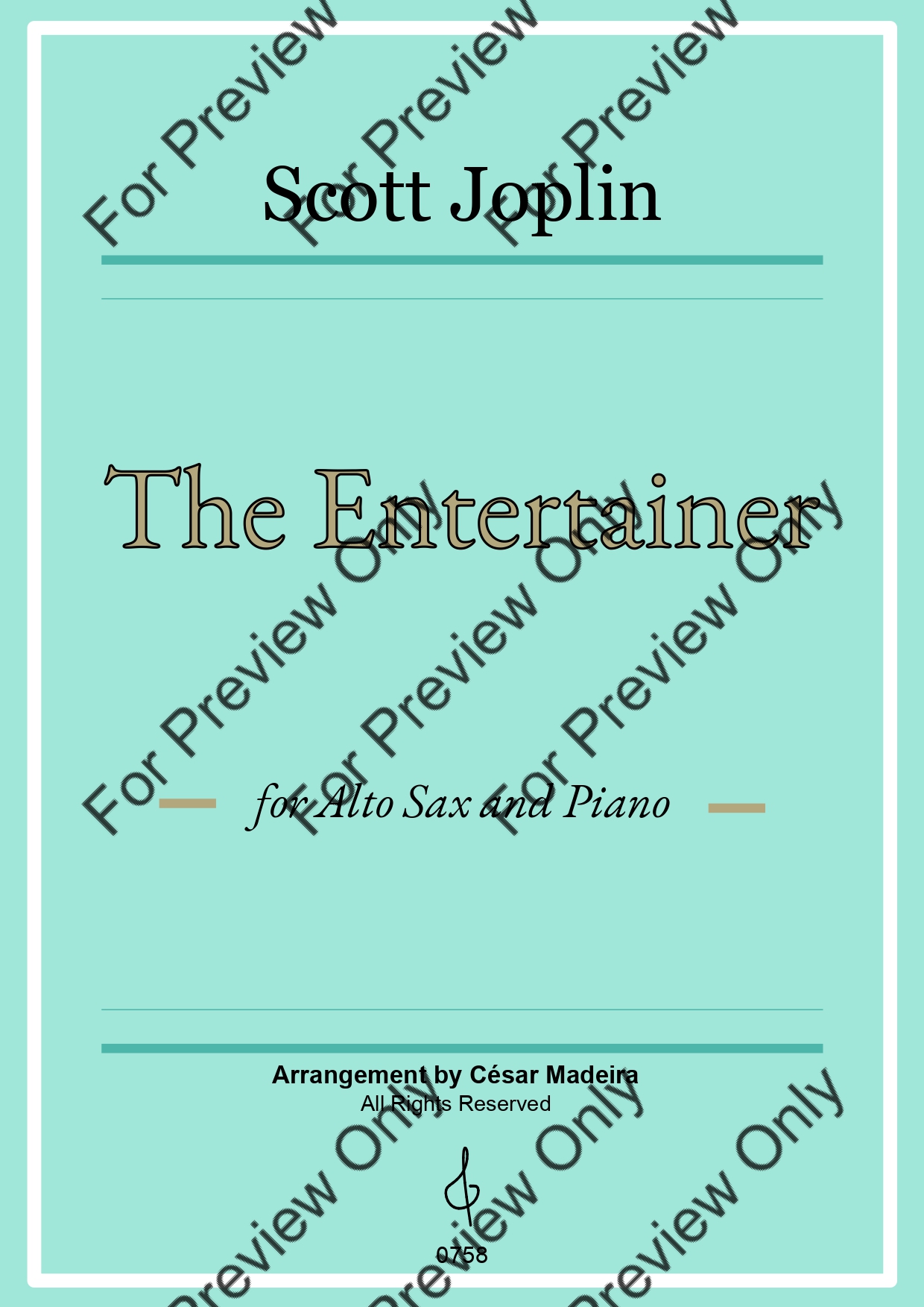 The Entertainer by Scott Joplin. Arrangement for Alto Saxophone and Piano. With Full Score and Individual Parts. Have fun!