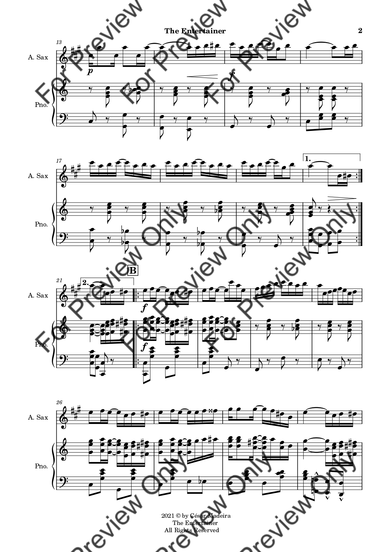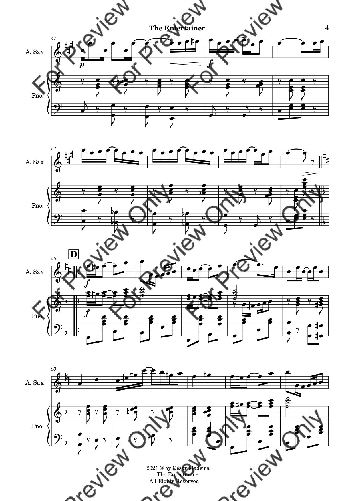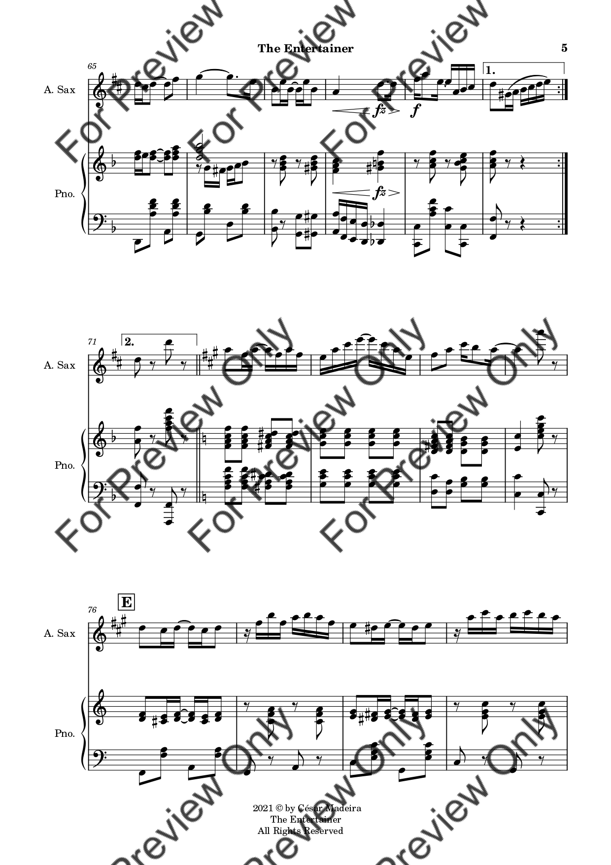 The Entertainer by Scott Joplin. Arrangement for Alto Saxophone and Piano. With Full Score and Individual Parts. Have fun!
