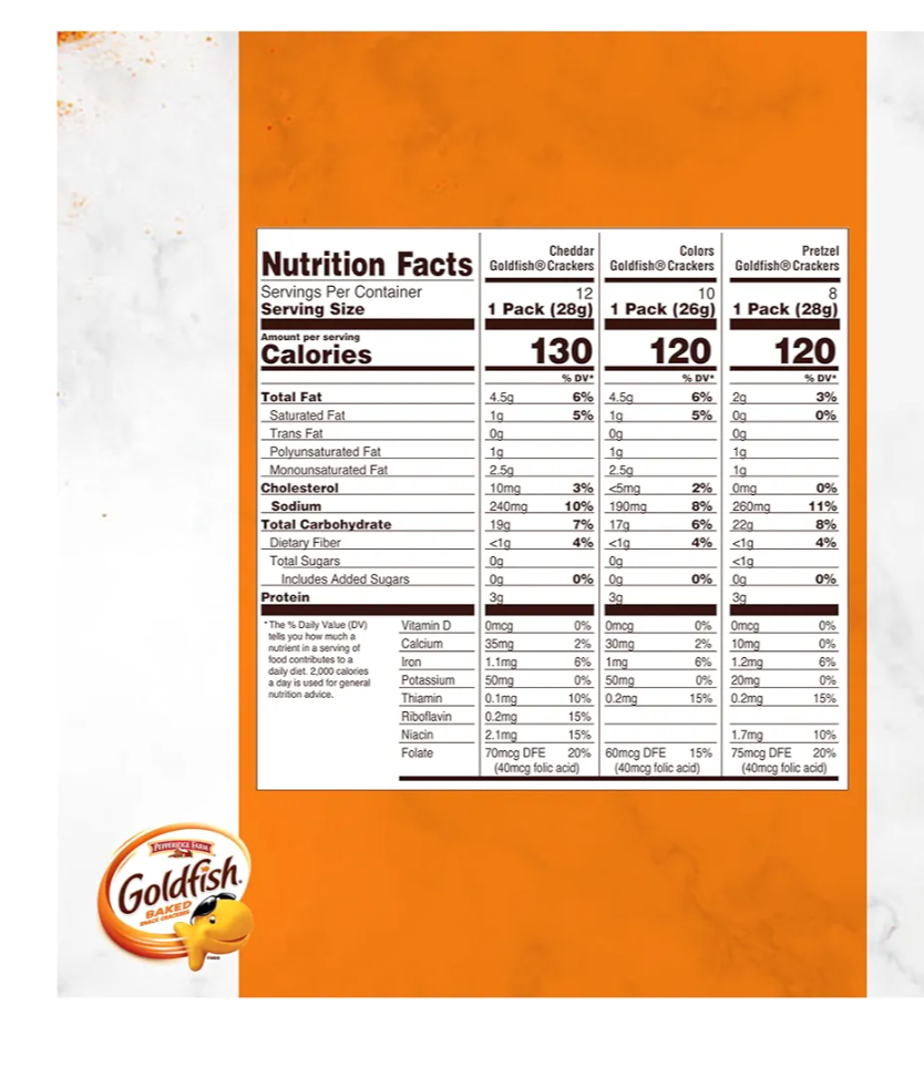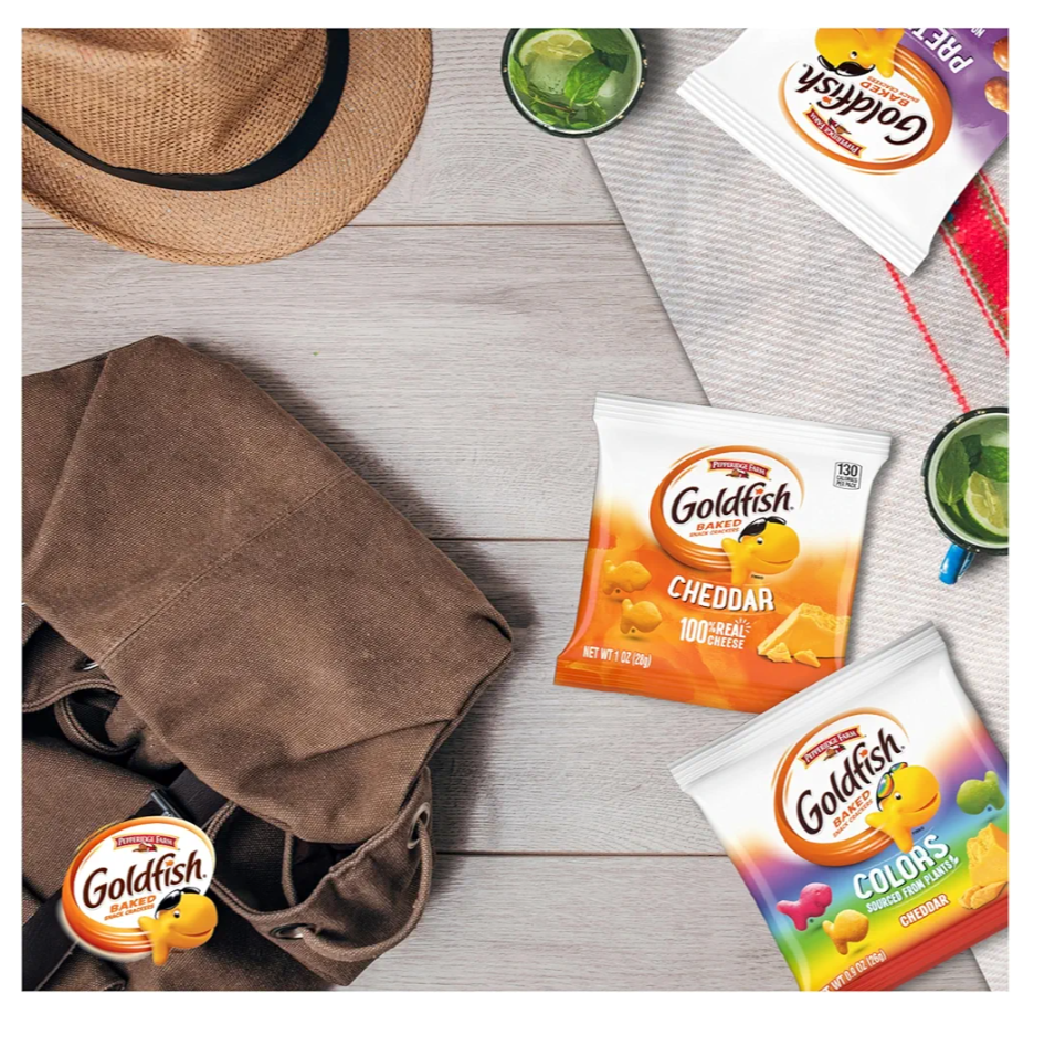 Variety pack includes: 10 single-serving packs of Goldfish colors, 12 packs of Goldfish cheddar, 8 packs of Goldfish pretzels