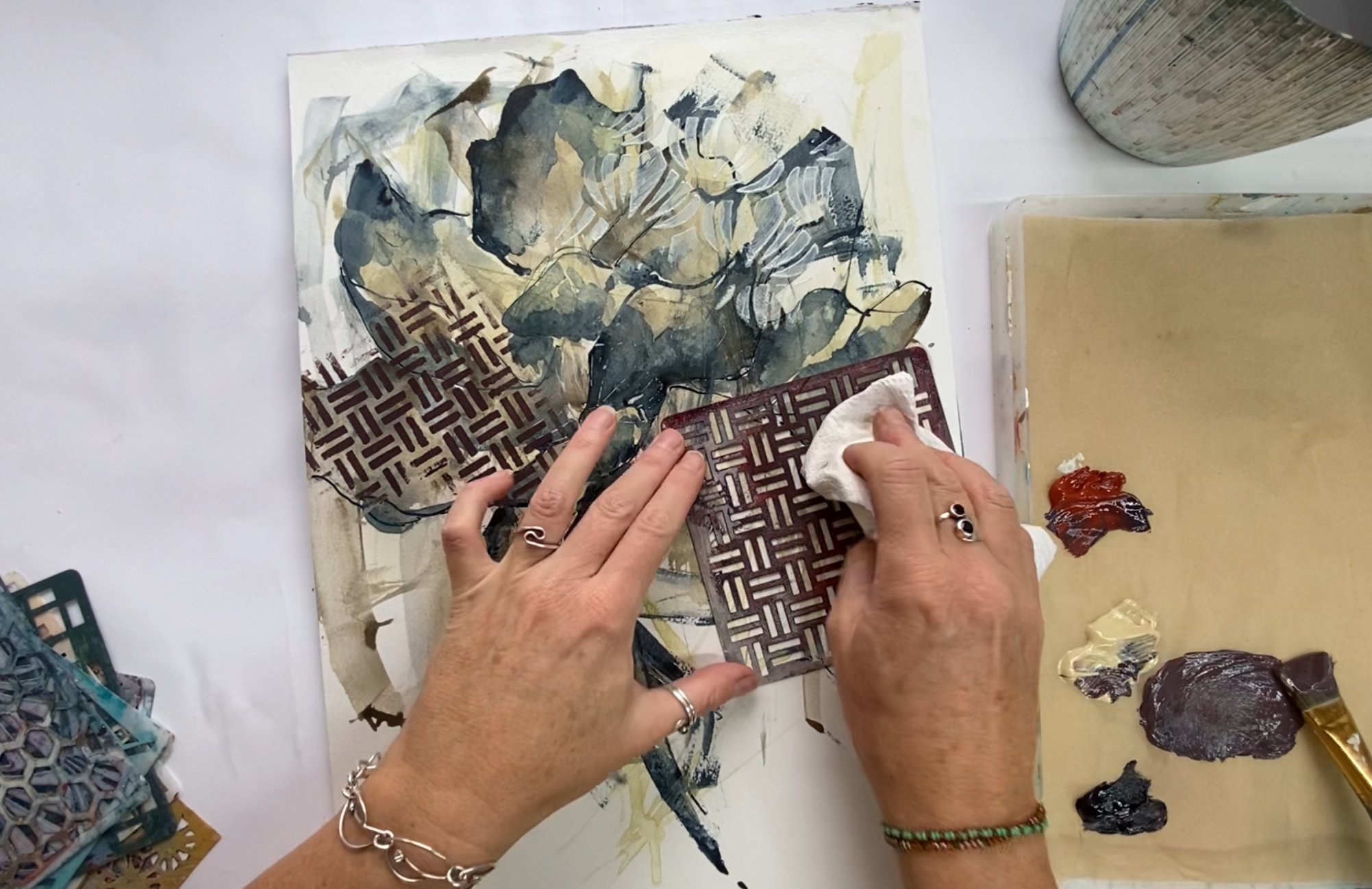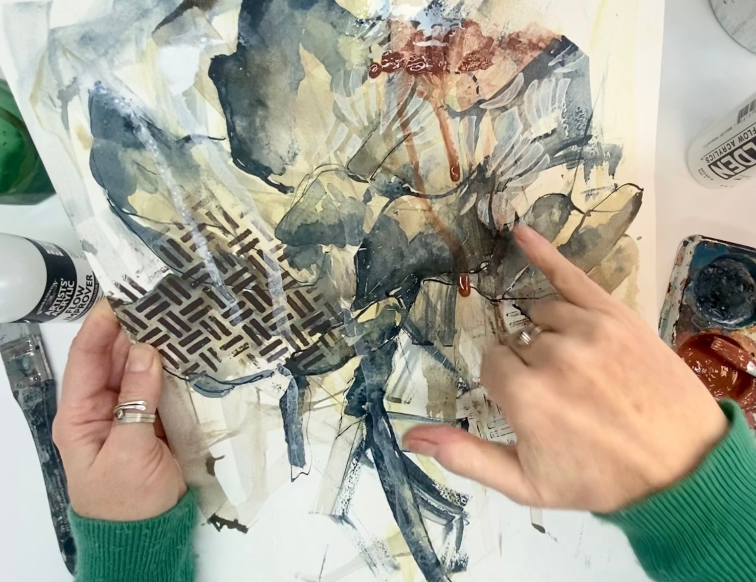 We'll use acrylic paint & acrylic inks to create 'happy accidents'. We'll add interesting elements with stencils & hand drawn pattern.