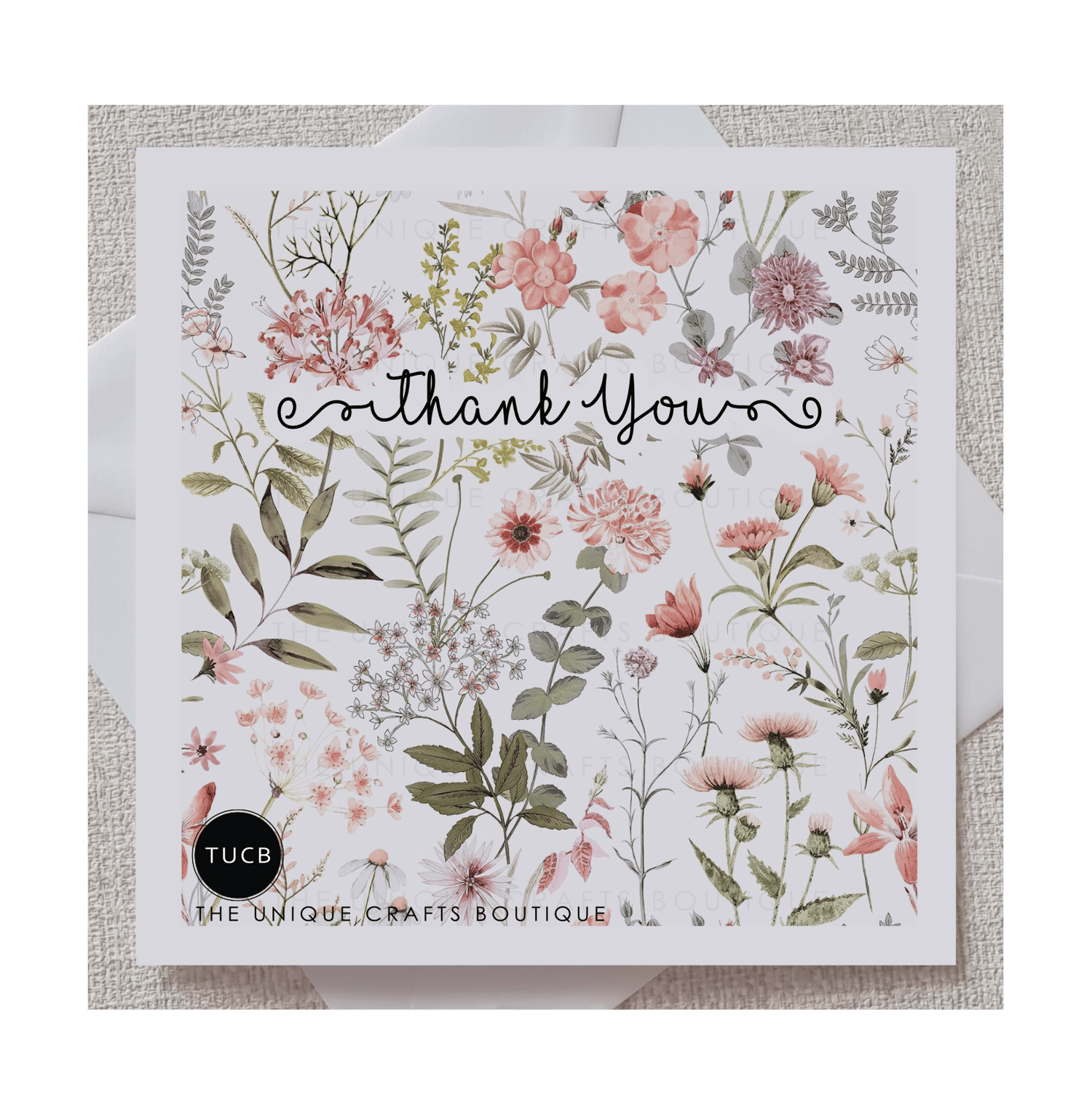 Printed with a pretty floral background and the message 'Thank you' scrolled through the centre written in Black. This card is cute and simple and perfect to show your appreciation.
