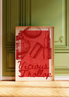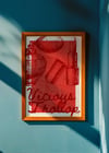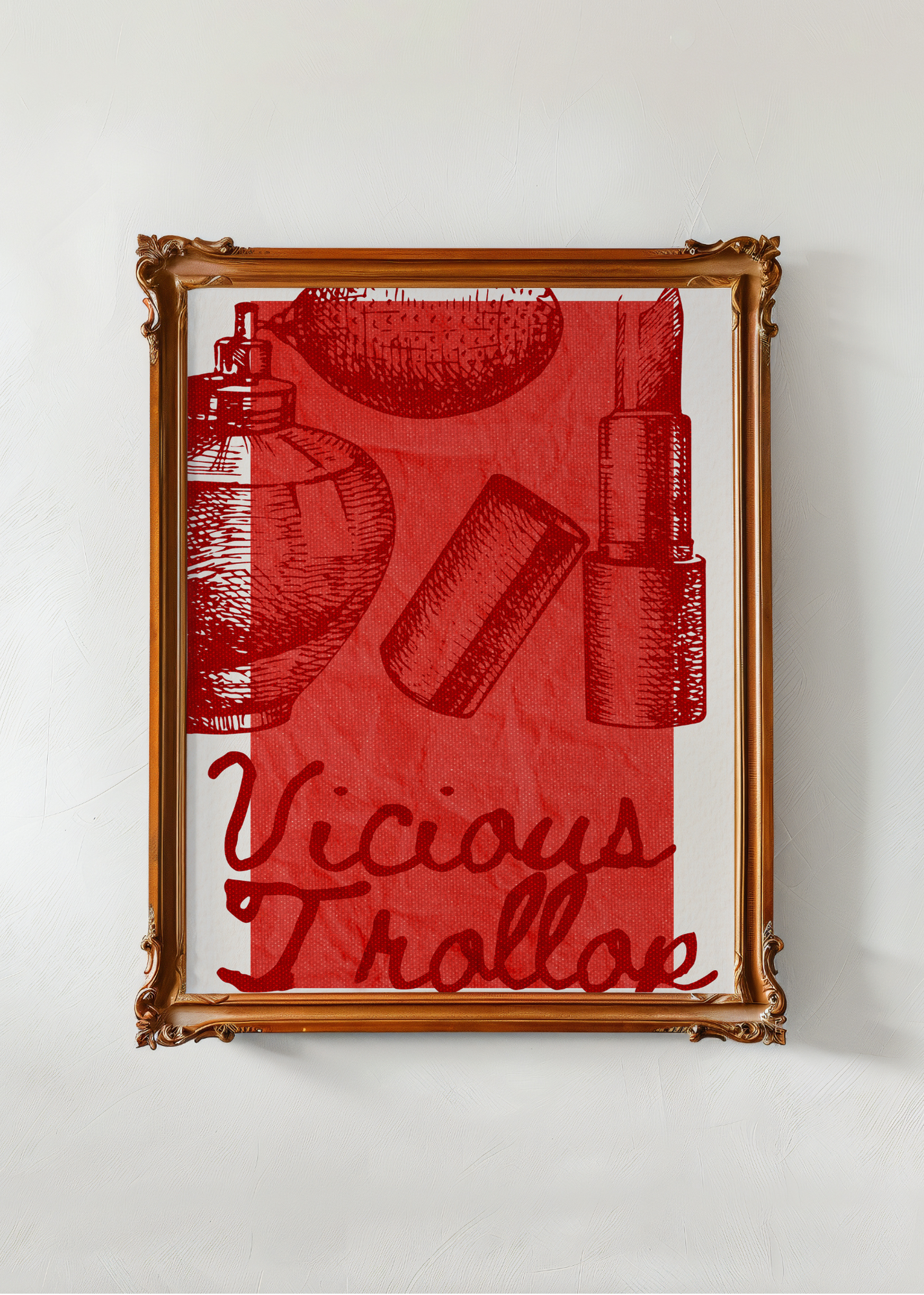Vicious Trollop 2— Simplicity meets sass in this charming tribute to Gilmore Girls. A white background frames a textured block of vibrant red, where a hand-drawn dark red lipstick and perfume bottle give off vintage glamour vibes. At the bottom, the playful phrase "vicious trollop" reminds us of that perfectly snarky moment between Lorelai and Emily. This print is for the ones who wear their boldness like lipstick and their humor like perfume.