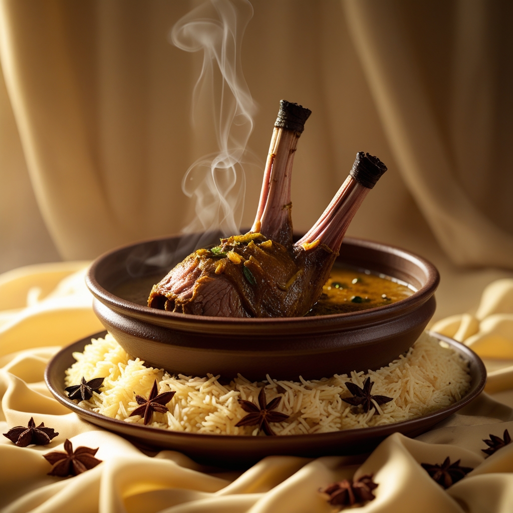 A warm and inviting professional food photography setup featuring Dum Pukht, a slow-cooked lamb dish, presented in a sealed earthen pot, placed atop a bed of aromatic saffron-infused rice, garnished with whole cardamom, star anise, and cloves, against a soft, creamy background that evokes a sense of comfort and luxury, with a hint of warm steam rising from the dish, bathed in warm, golden indoor light, emphasizing the rich flavors and aromas of the traditional Indian cuisine, with a shallow depth of field, blurring the surrounding elements, and drawing the viewer's attention to the tender, slow-cooked lamb, and the delicate arrangement of spices on the rice.