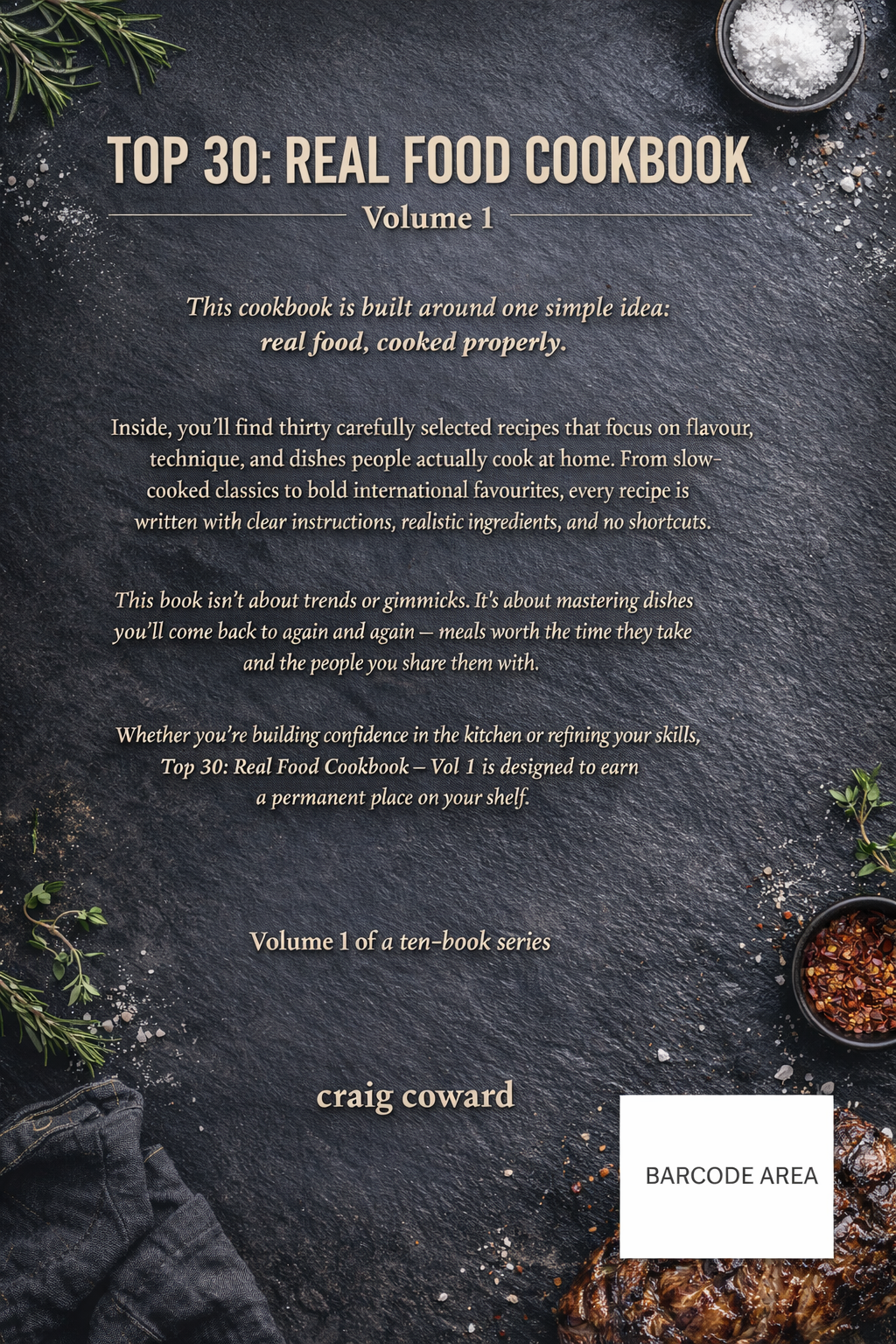 Top 30™: Real Food Cookbook — Vol 1 is not built on trends, shortcuts, or gimmicks. Every recipe in this book was chosen because it delivers bold flavor, honest technique, and results you can be proud of. These are dishes meant to be cooked properly — the kind you come back to, refine, and eventually make your own.