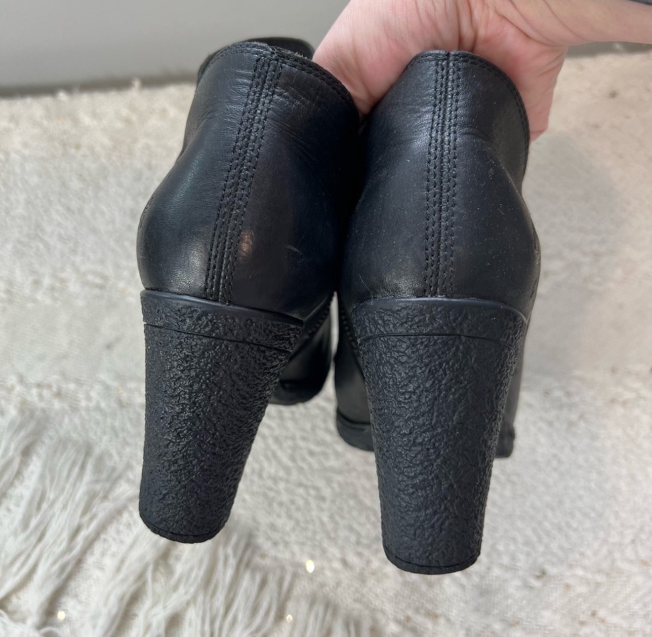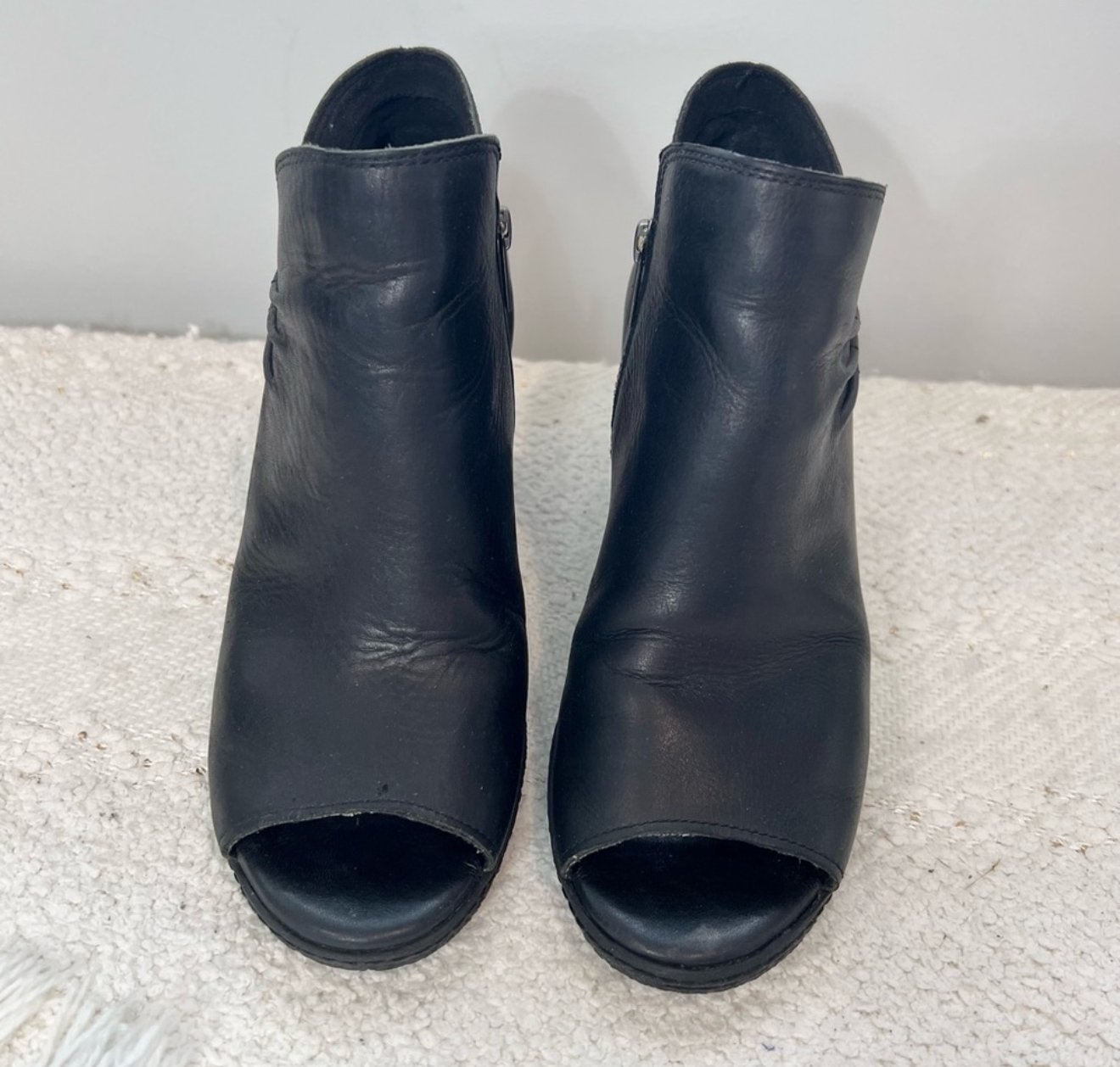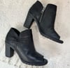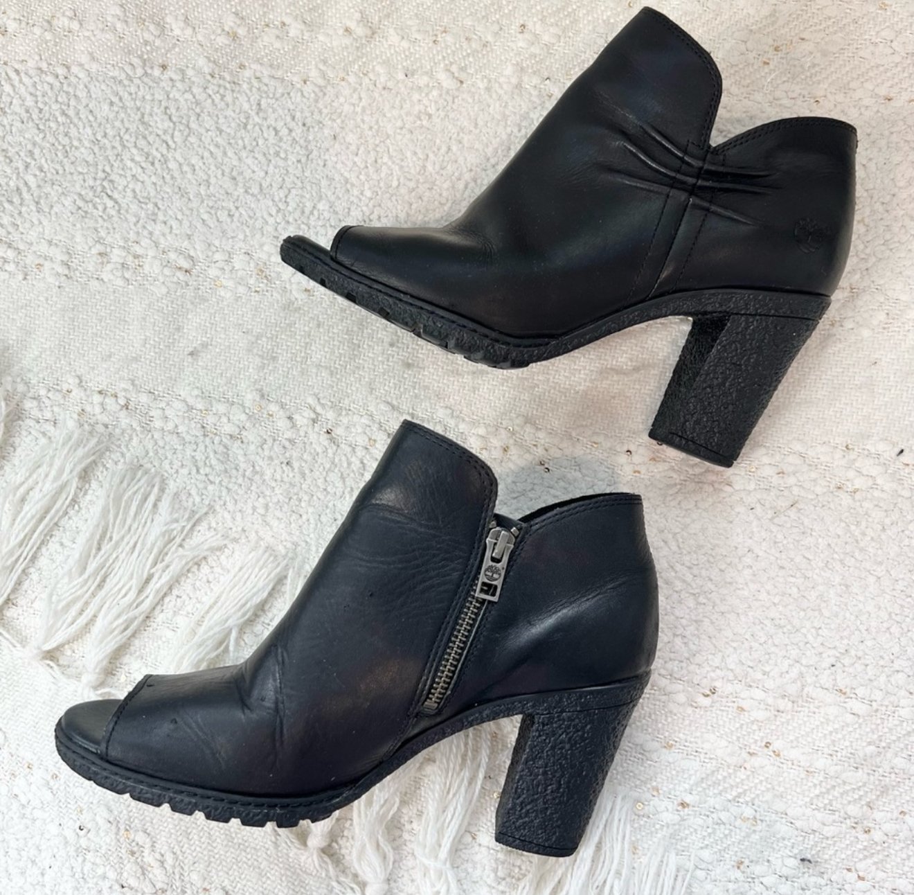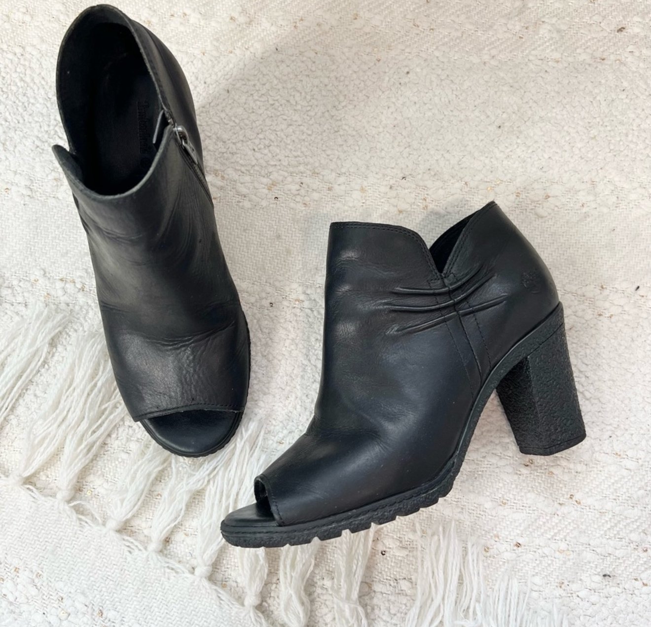 Timberland black leather peep toe high heel ankle boots with a ruched detail and inner zipper closure.