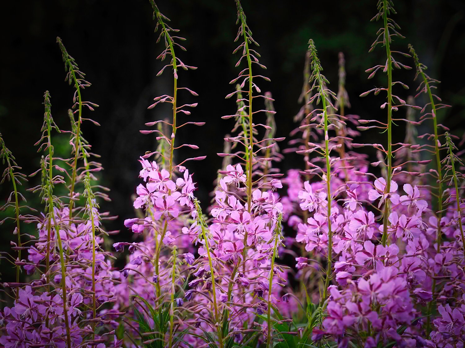 Willow herbs (Epilobium angustifolium) shine on the edge of the field.