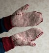 In the mittens shown in the photos, the main color is red and the contrast color is white.