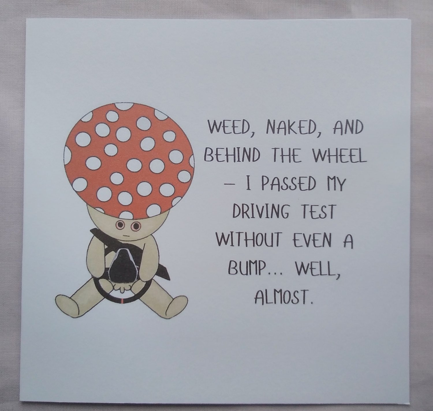 Looking for a cheeky way to celebrate someone passing their driving test (18+ only)? This funny square card says it all: Weed, naked, and behind the wheel — I passed my driving test without even a bump… well, almost. Perfect for new drivers with a sense of humor, or as a hilarious keepsake from friends who love to celebrate big wins with even bigger laughs!